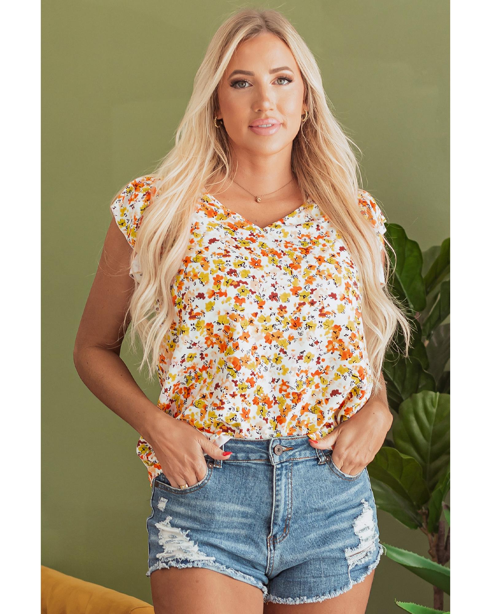 Green Floral Print Ruffled Sleeveless V Neck Tank Top – XL