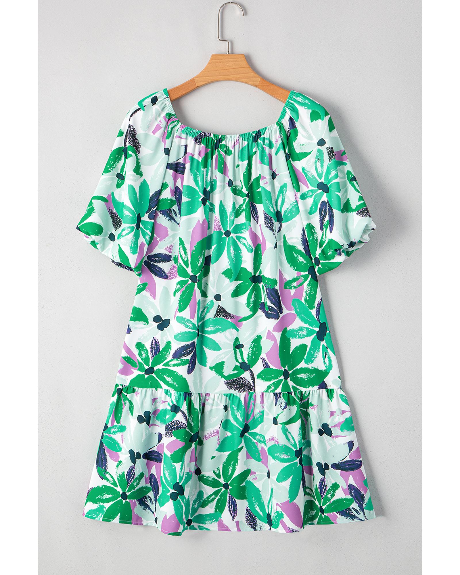 Green Floral Print Shirred Square Neck Loose Fit Mini Dress – XL