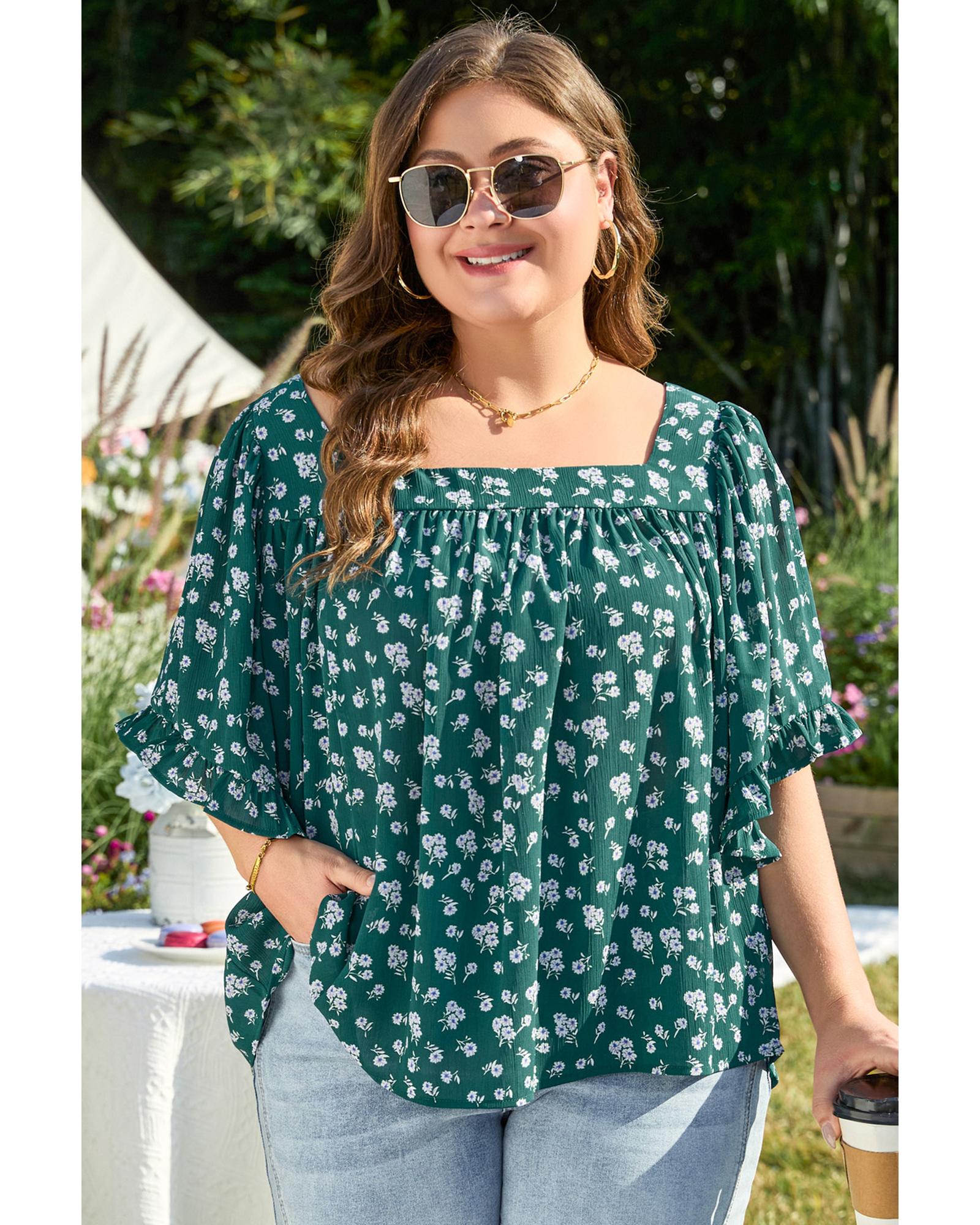 Green Floral Print Square Neck Ruffled Trim Plus Size Blouse – 1X