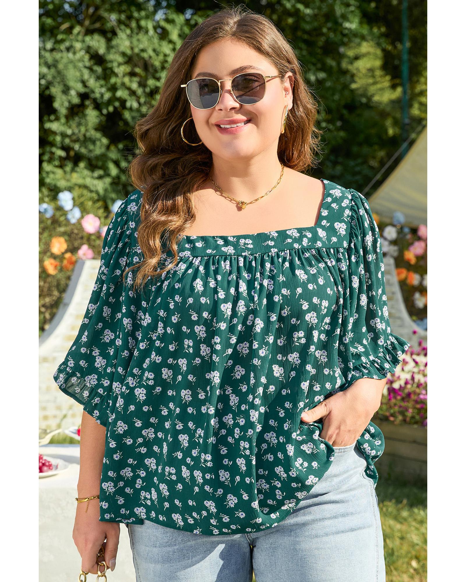 Green Floral Print Square Neck Ruffled Trim Plus Size Blouse – 3X
