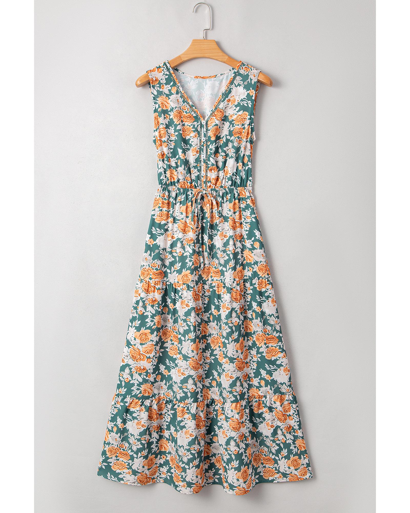 Green Floral Print Trimmed V Neck Tie Waist Sleeveless Holiday Long Dress – L