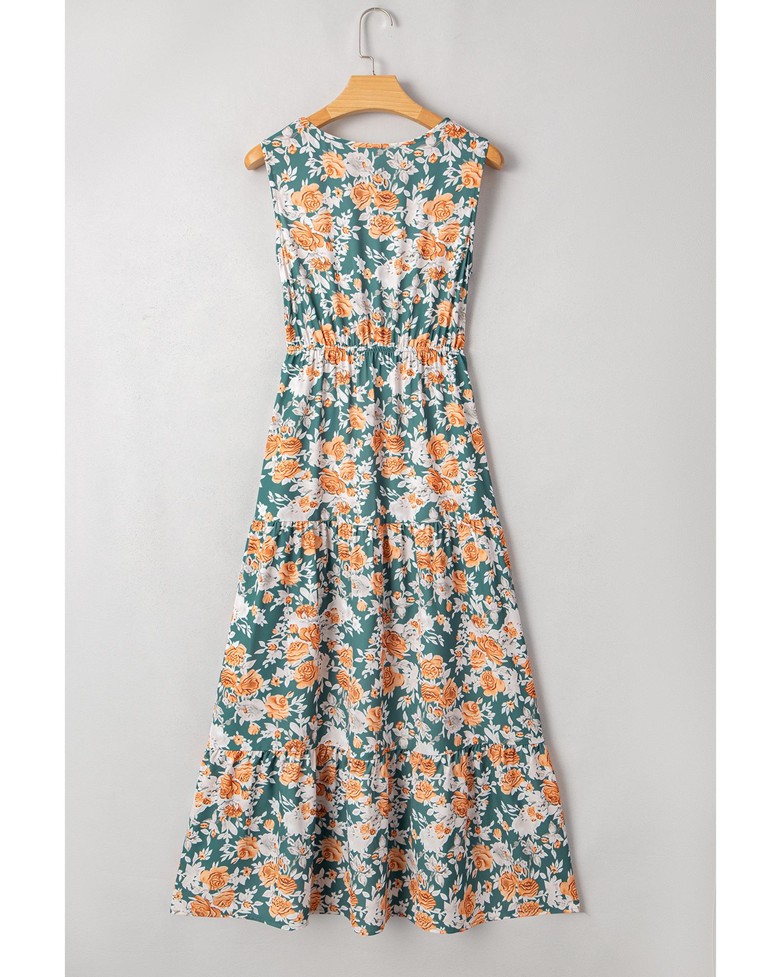 Green Floral Print Trimmed V Neck Tie Waist Sleeveless Holiday Long Dress – M