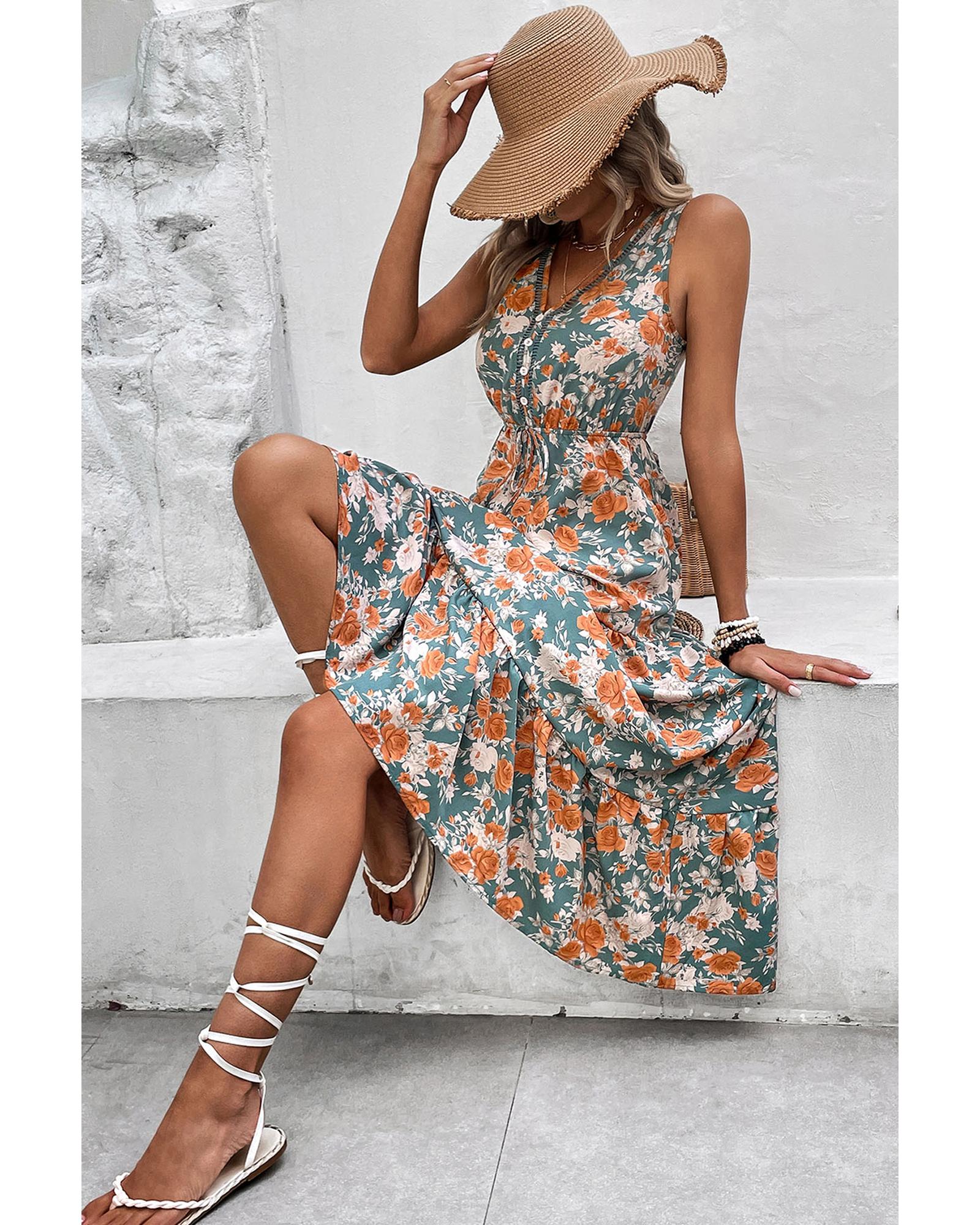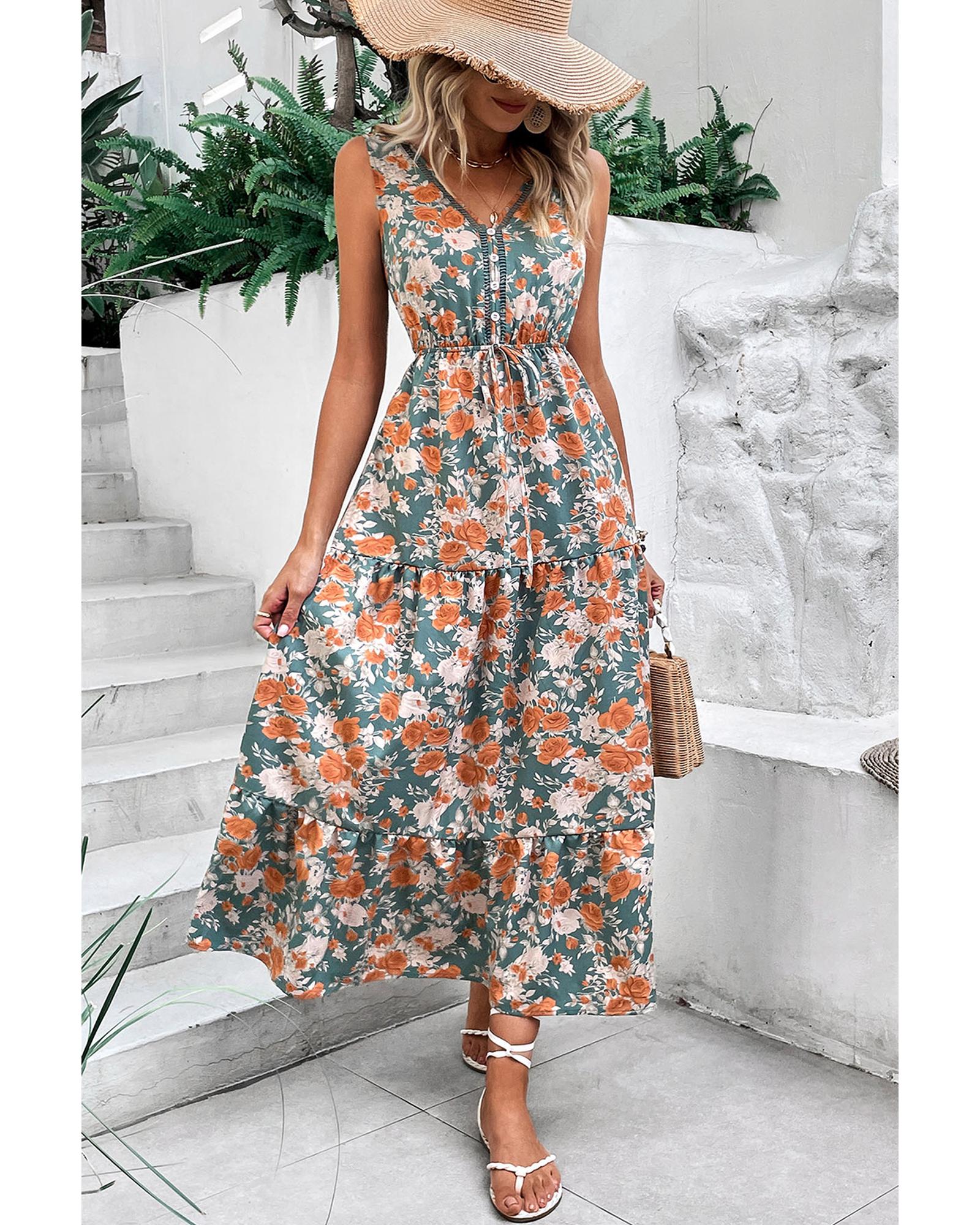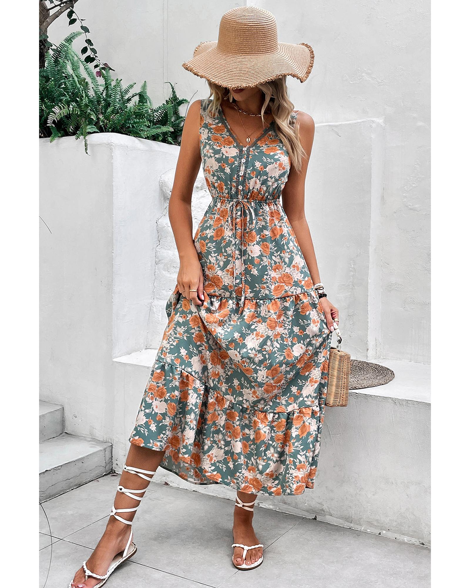 Green Floral Print Trimmed V Neck Tie Waist Sleeveless Holiday Long Dress – XL
