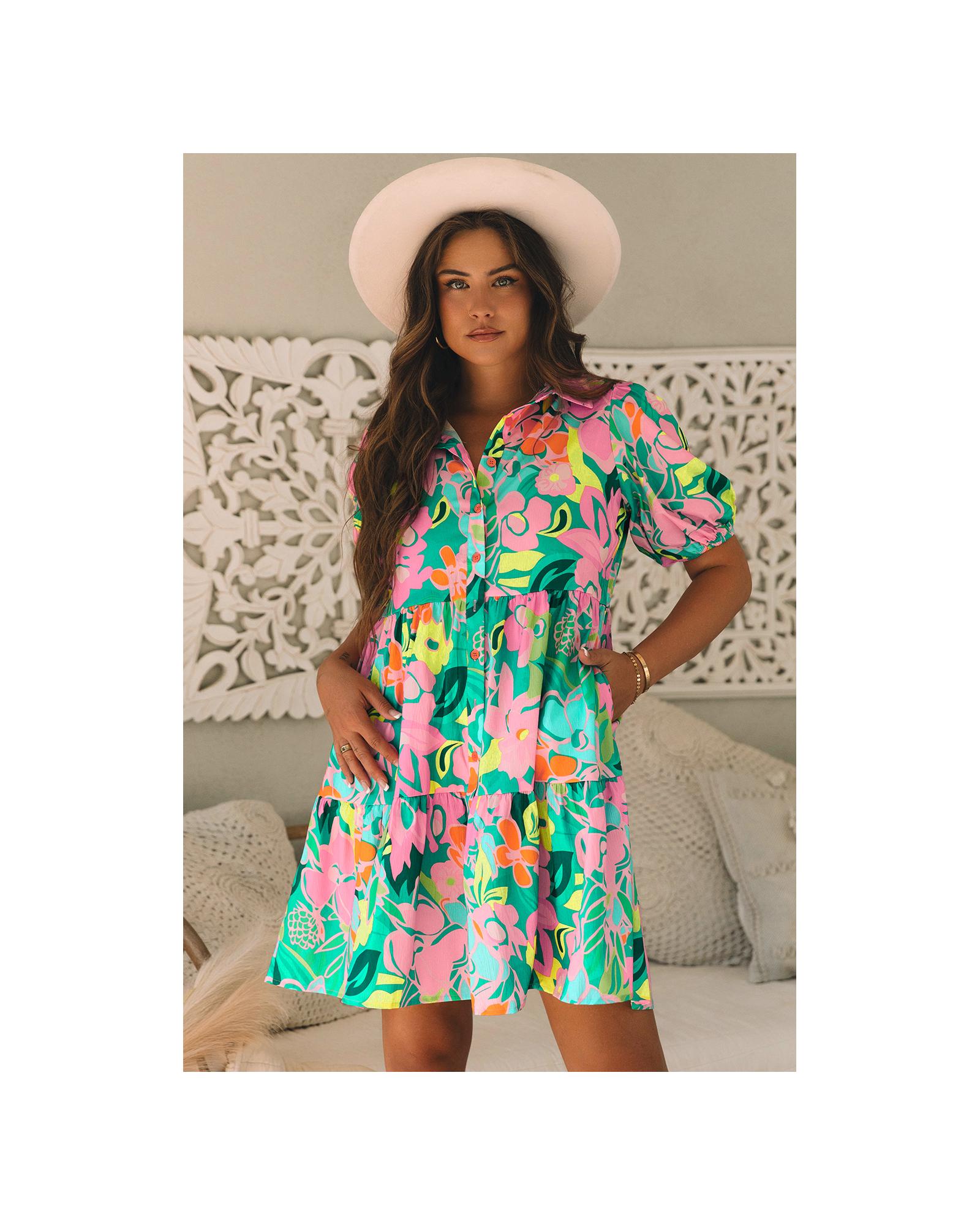 - Green Floral Puff Sleeve Collar Buttoned Babydoll Dress