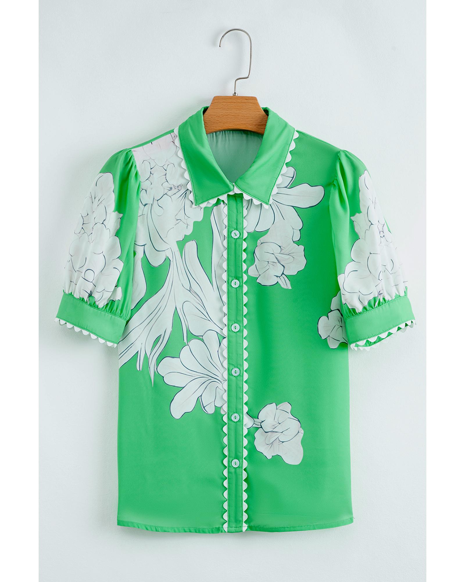 - Green Floral Ric Rac Edge Puff Sleeve Button Up Summer Shirt