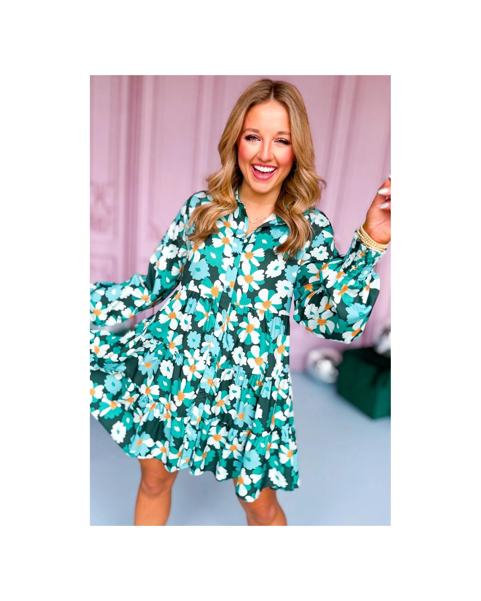 Green Floral Tiered Long Puff Sleeve Shirt Dress – M