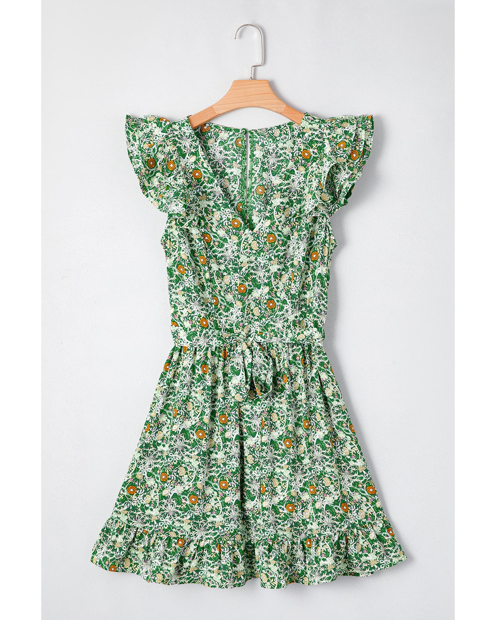 Green Flower Print Flutter Sleeve V Neck Sashed Ruffled Mini Dress – XL