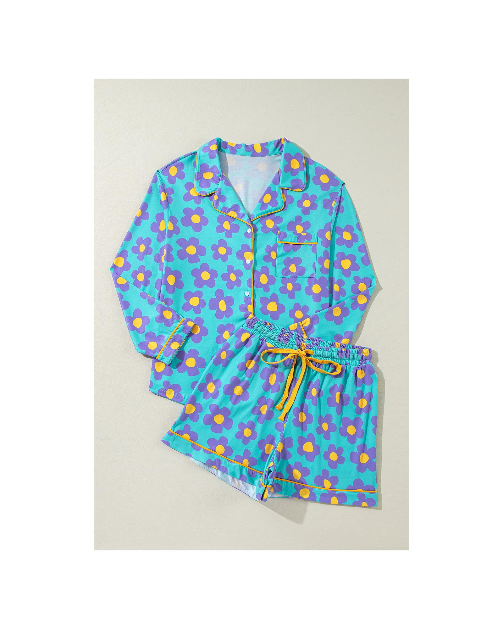 • Green Flower Print Long Sleeve Shirt Shorts Pajamas Set