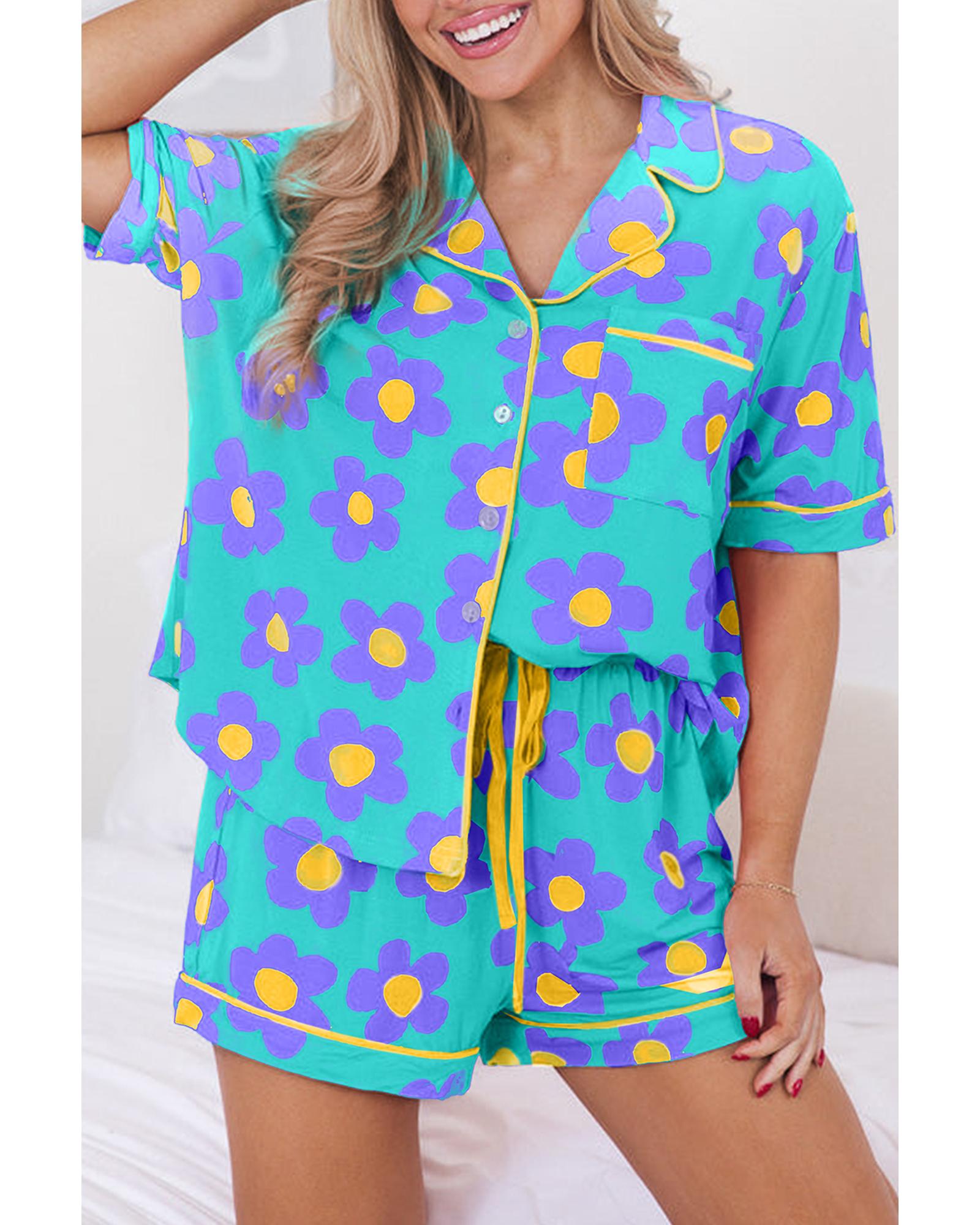 - Green flower print short sleeve pajama set