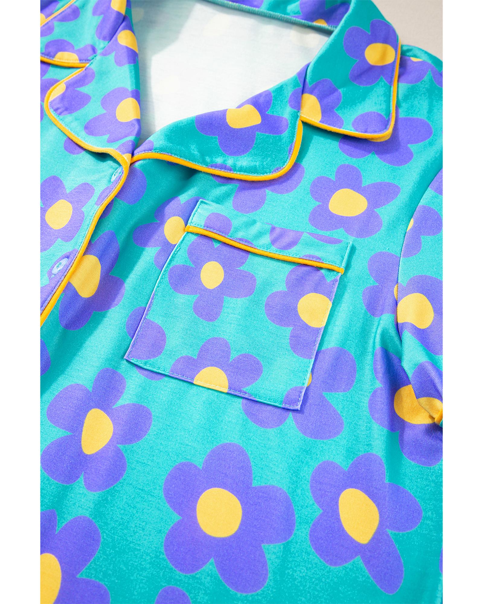 Green Flower Print Short Sleeve Shirt Pajamas Set – S