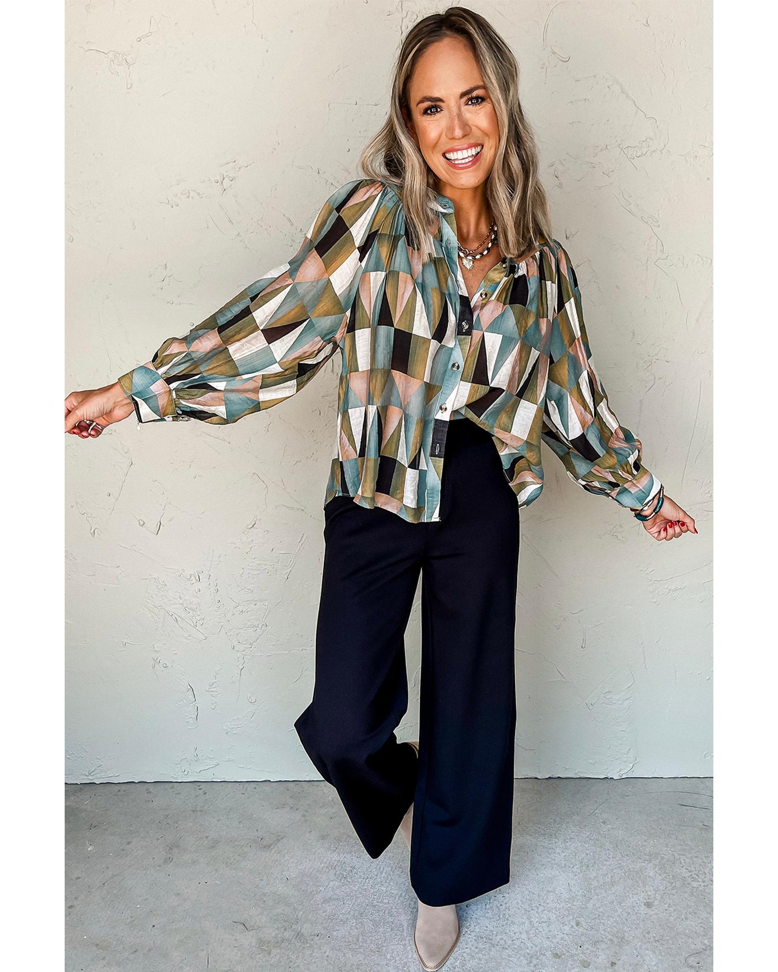 Green Geometric Print Buttoned Balloon Sleeve Loose Fit Shirt – L