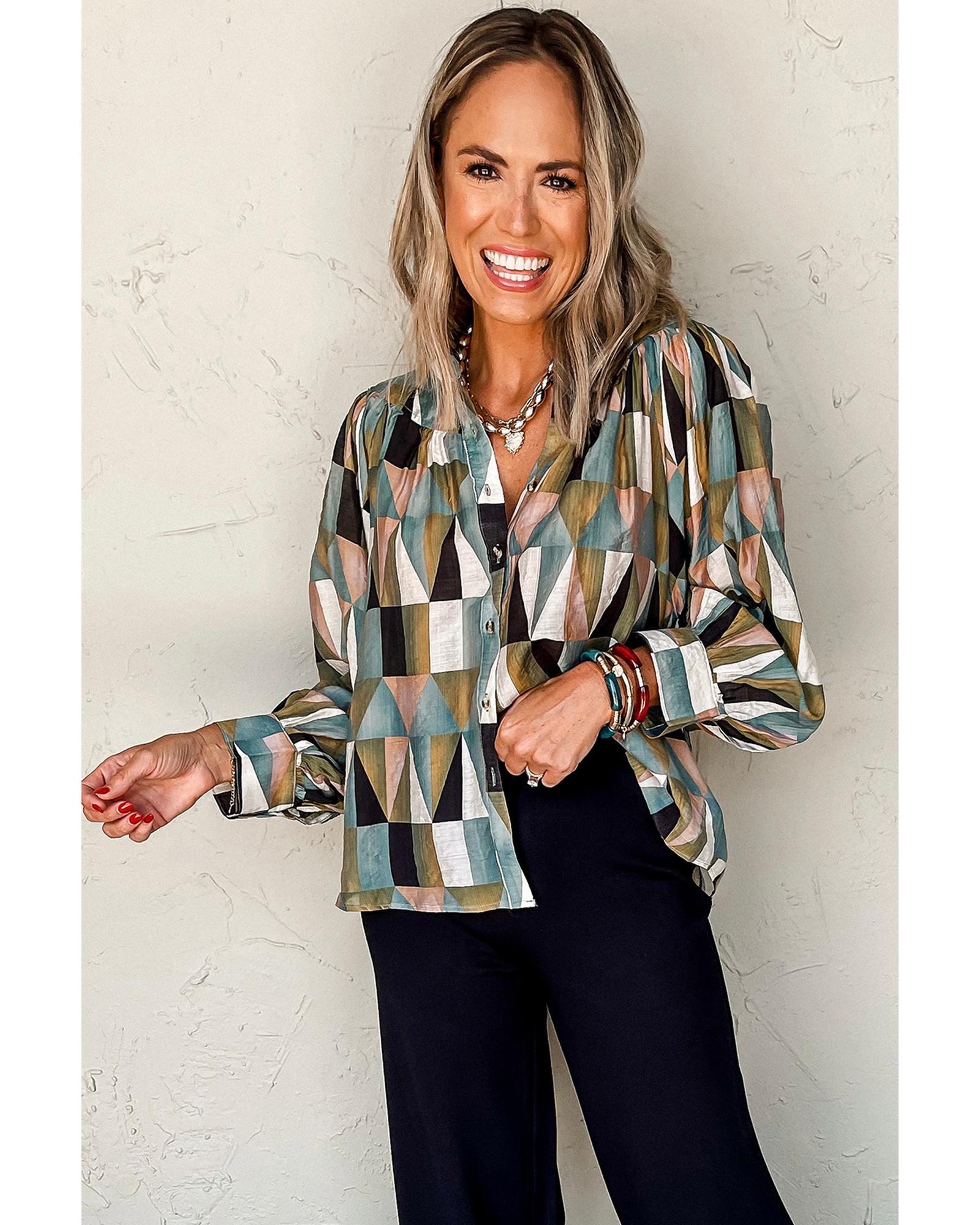 Green Geometric Print Buttoned Balloon Sleeve Loose Fit Shirt – S