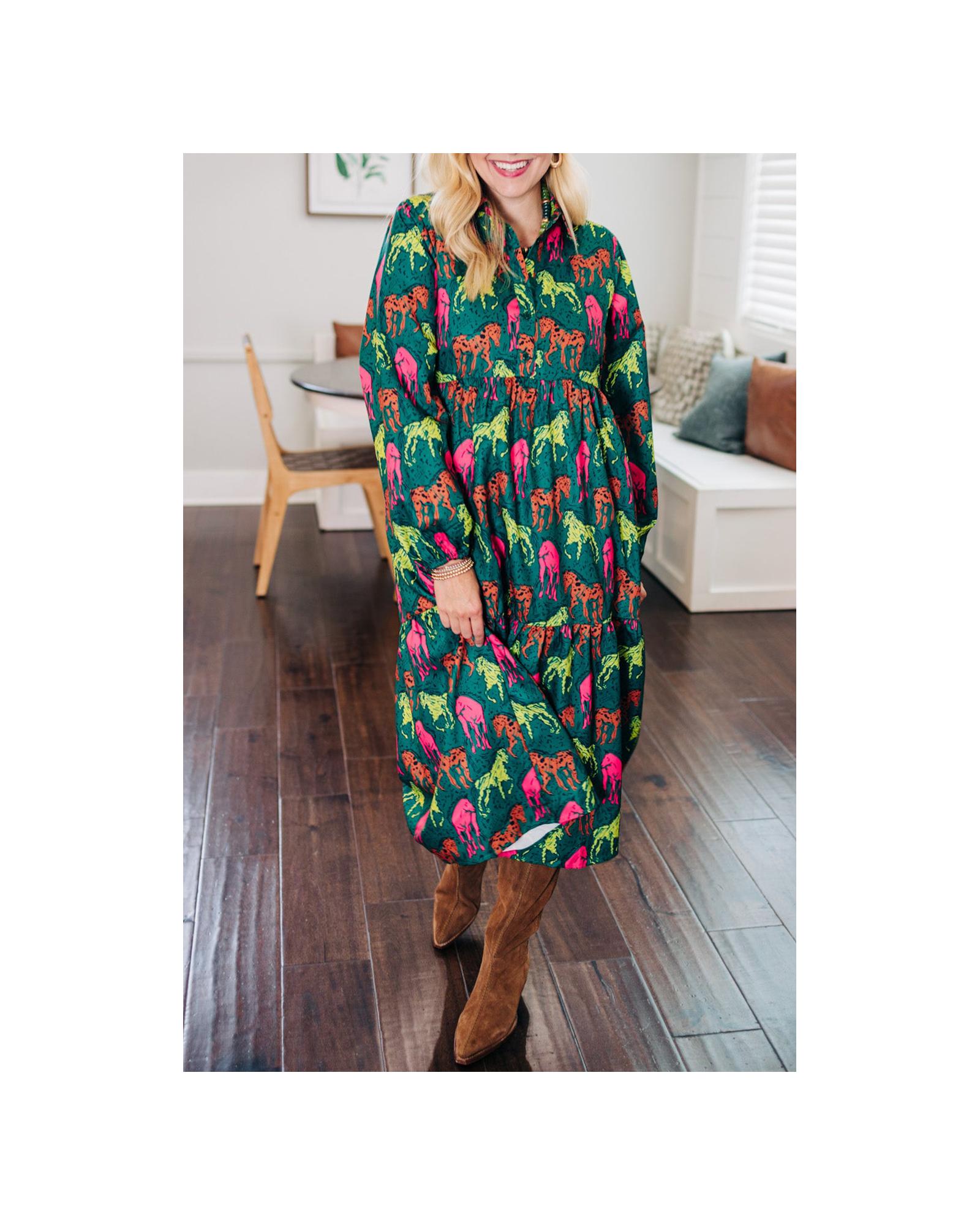 Green Horse Printed Long Sleeve Collared Buttoned Plus Size Midi Dress - 1X Original price was: $83.99.Current price is: $45.99.