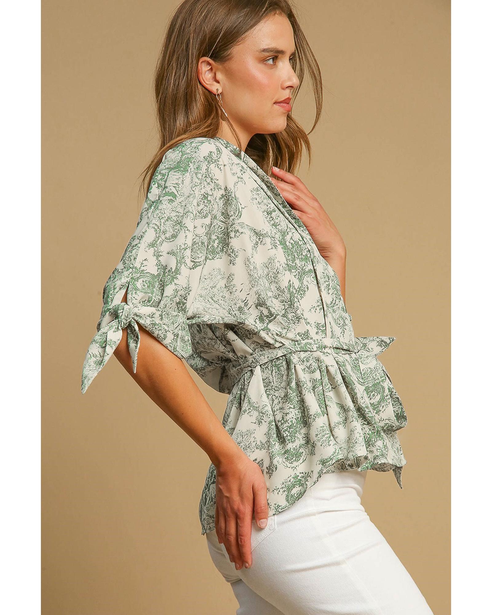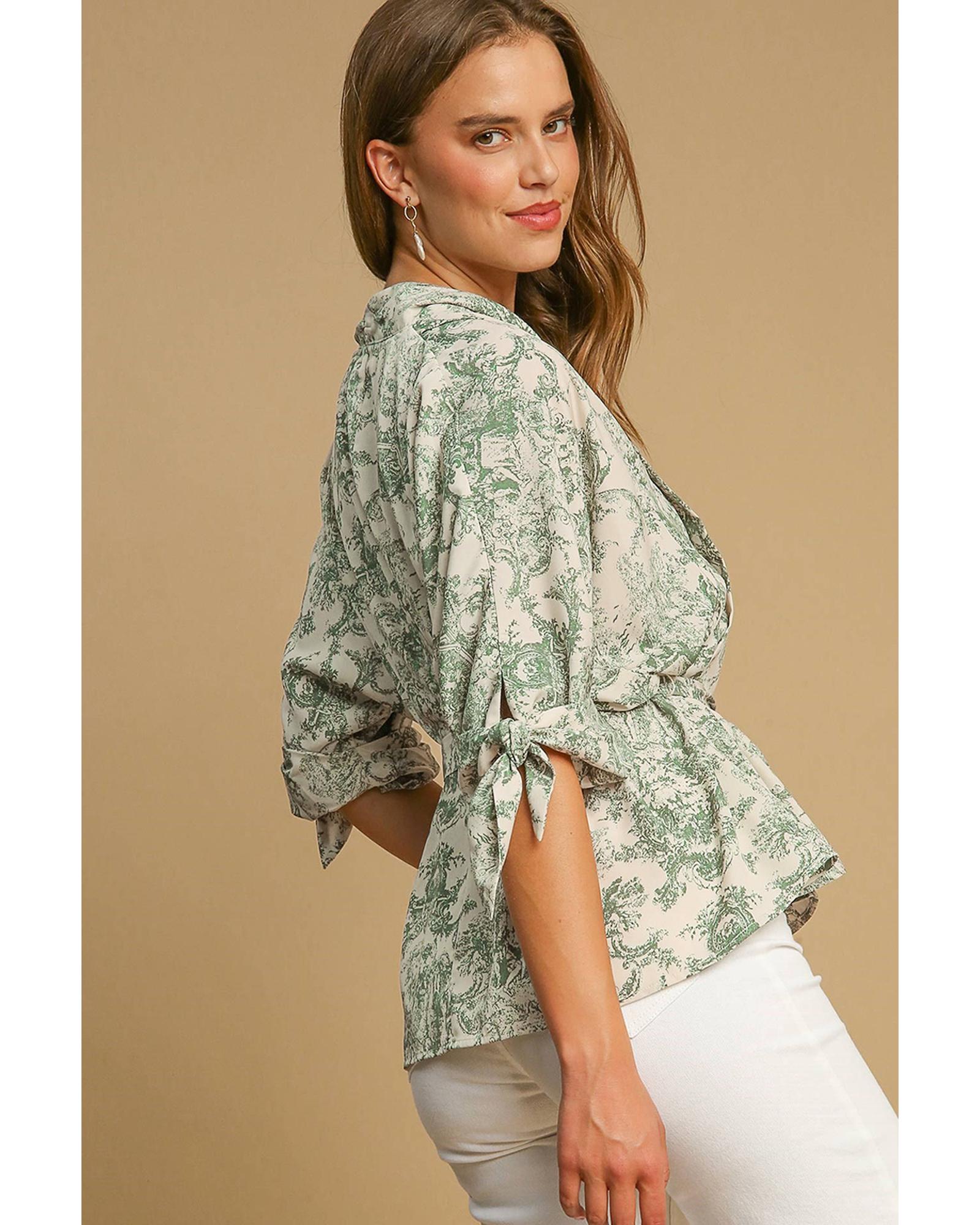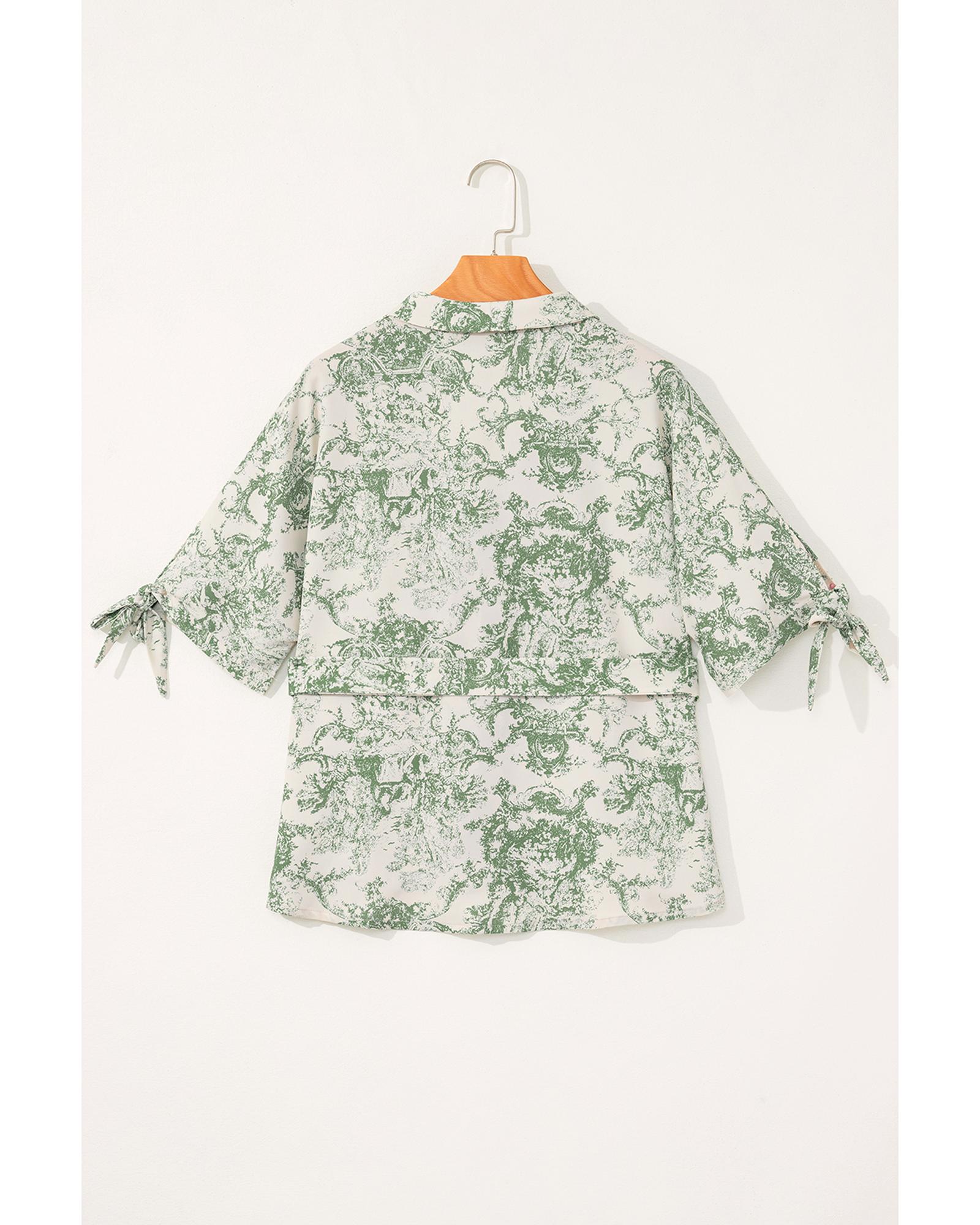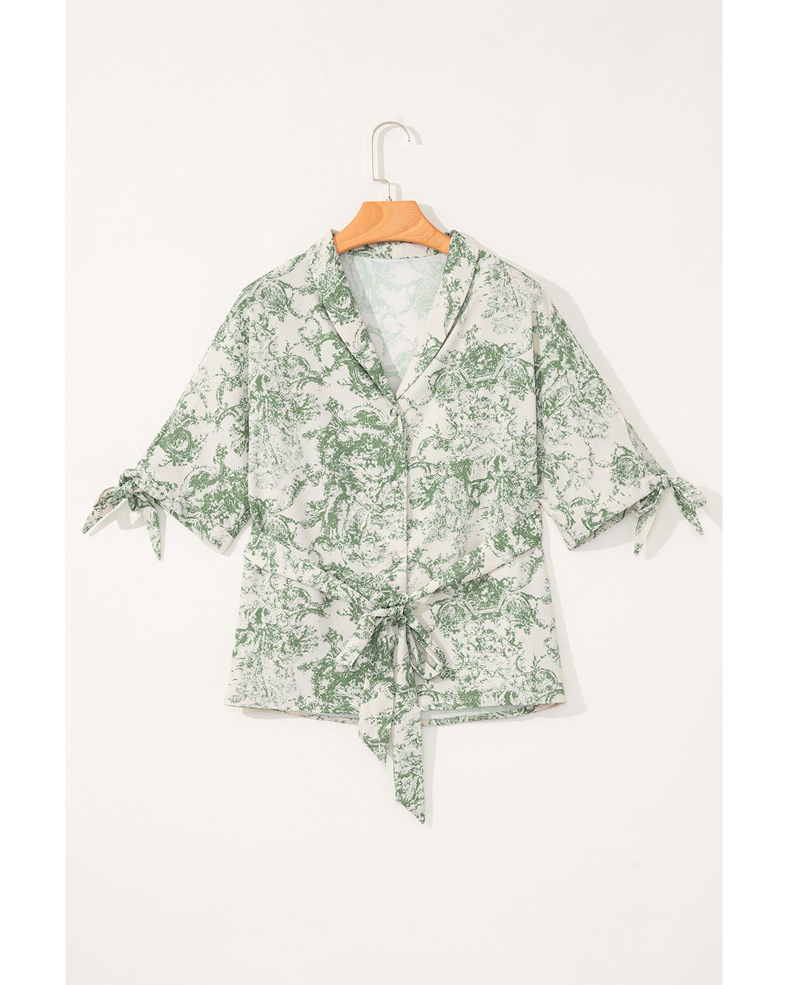 Green Landscape Print Tied 3/4 Sleeve Shirt with Sash – XL
