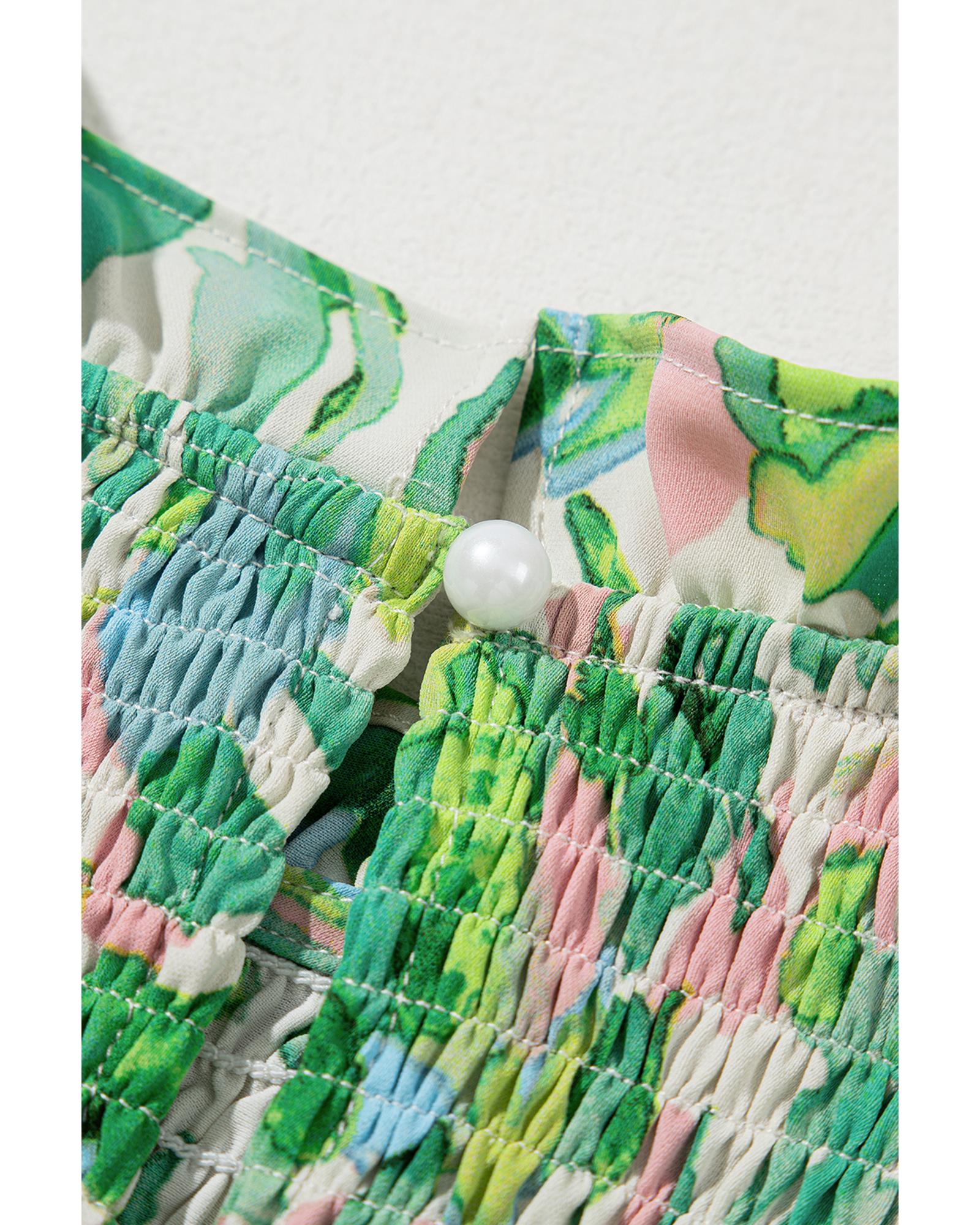 Green Leafy Printed Flounce Sleeve Shirred Mock Neck Blouse – L