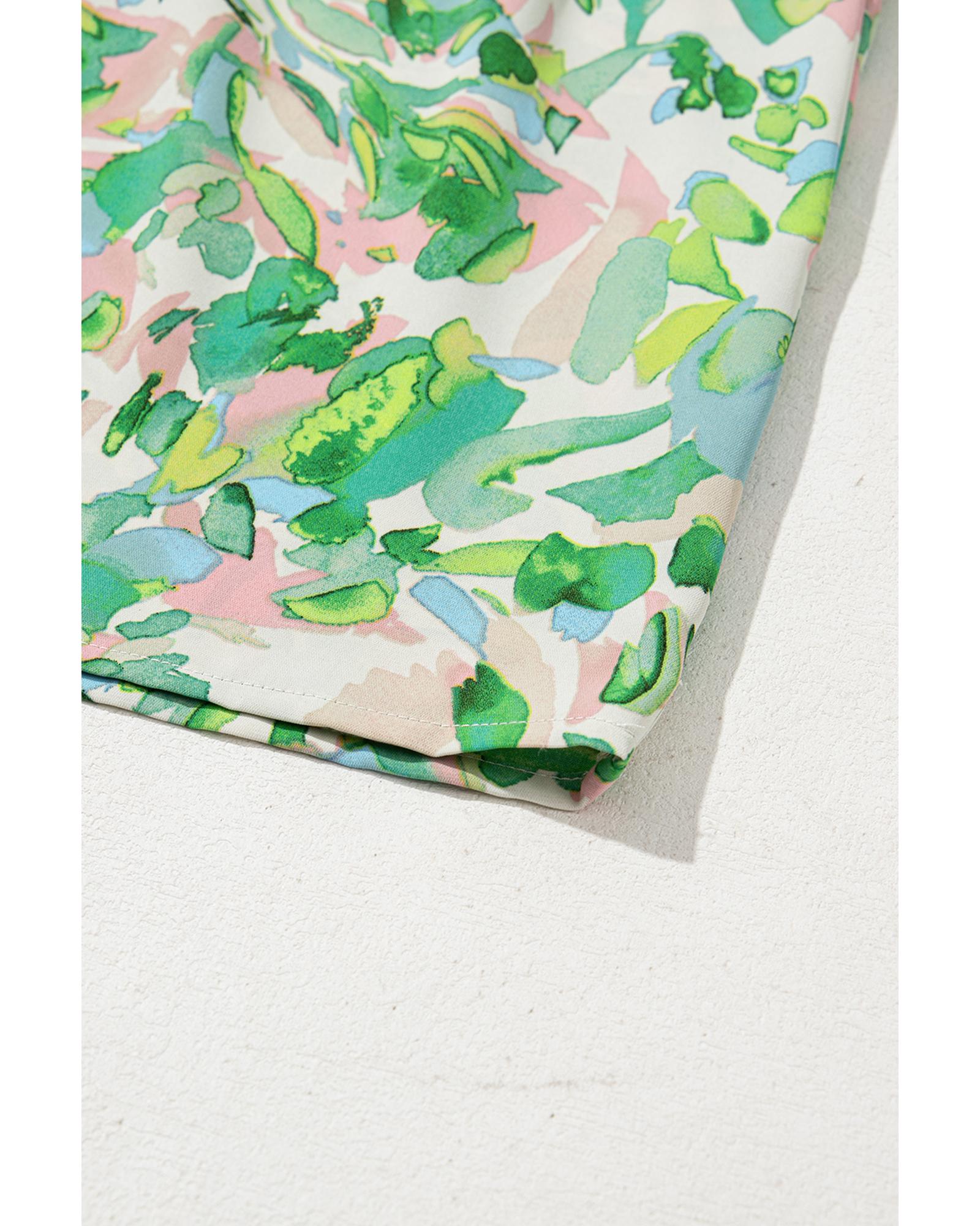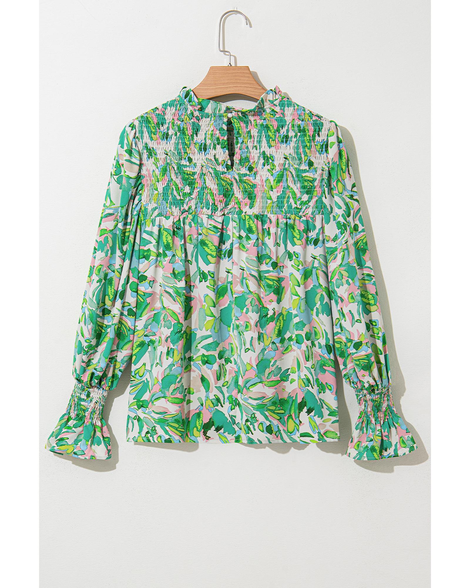 Green Leafy Printed Flounce Sleeve Shirred Mock Neck Blouse – M