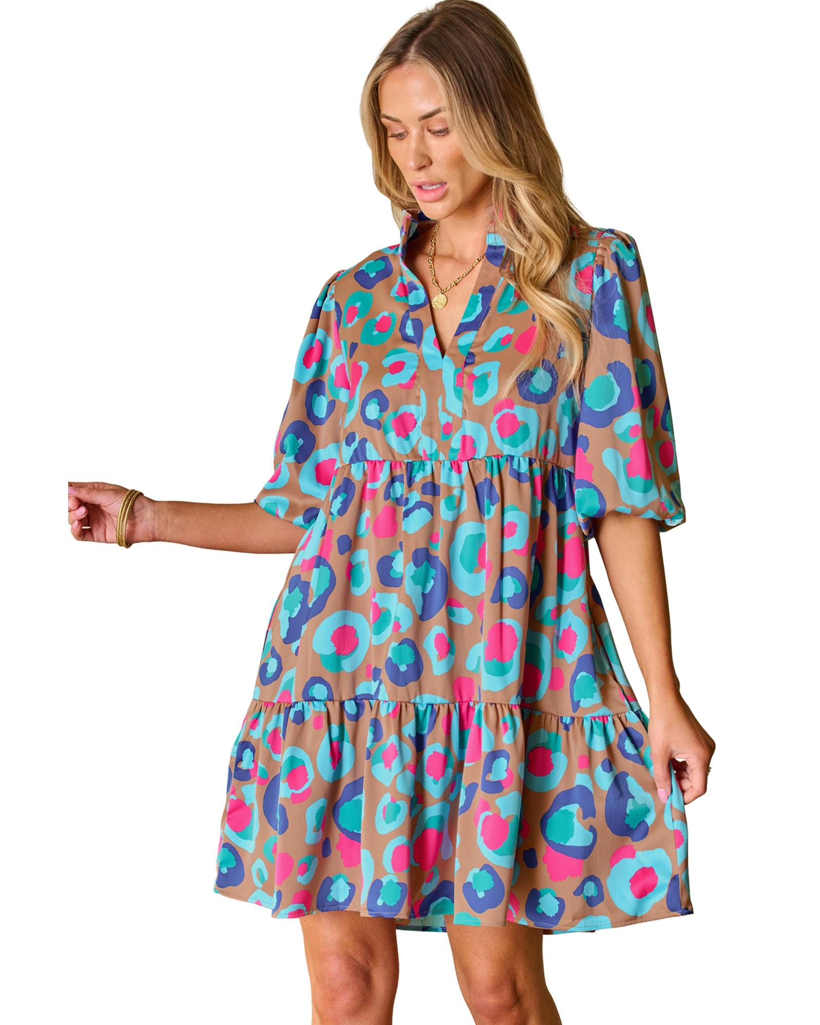 Green Leopard Print Bubble Sleeve Slit Neck Ruffled Dress – L