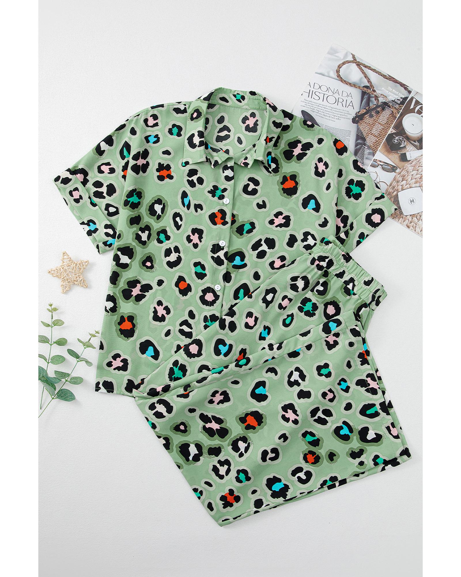 - Green Leopard Print Short Sleeve Shirt and Wide Leg Pants Set