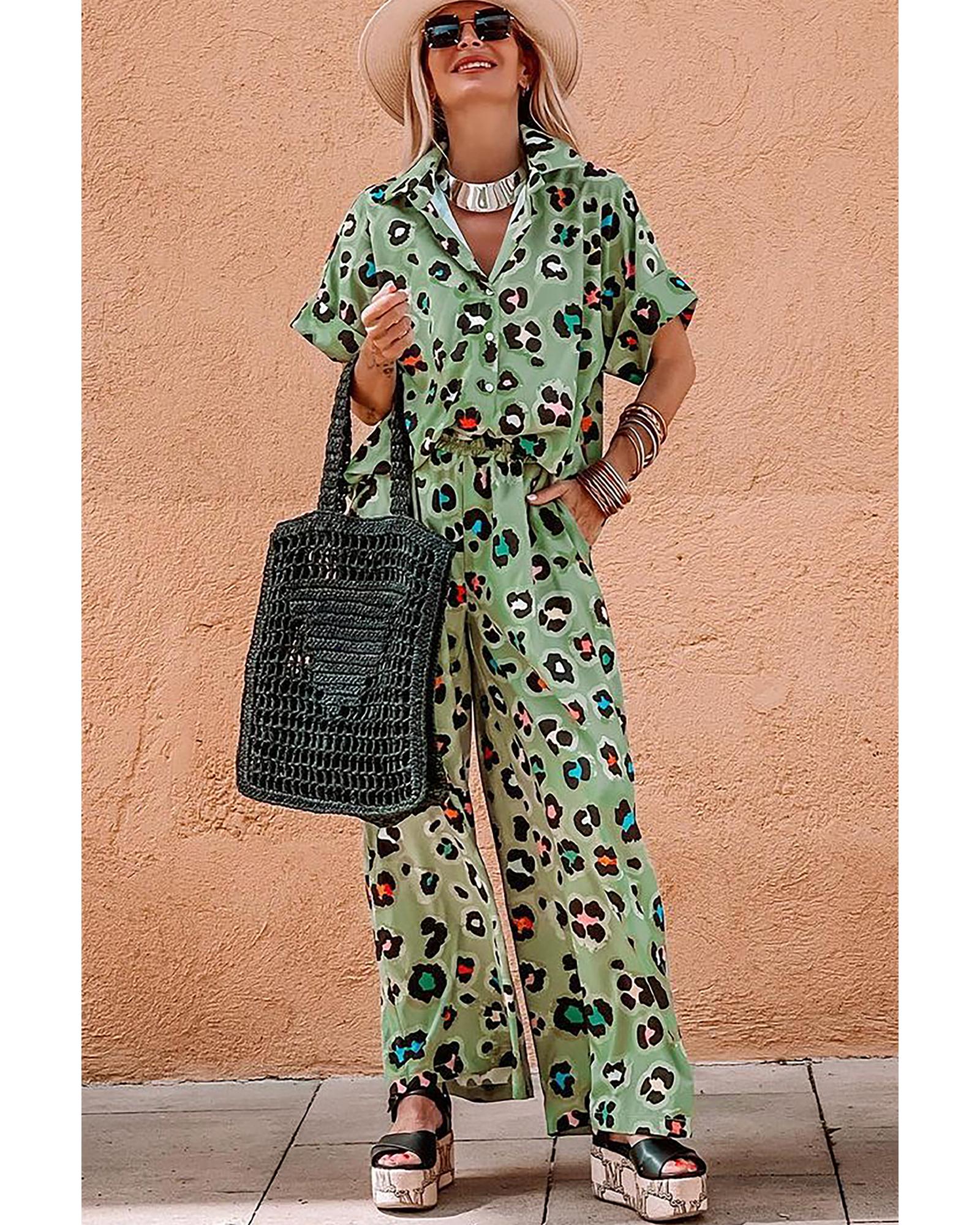 - Green Leopard Print Short Sleeve Shirt and Wide Leg Pants Set