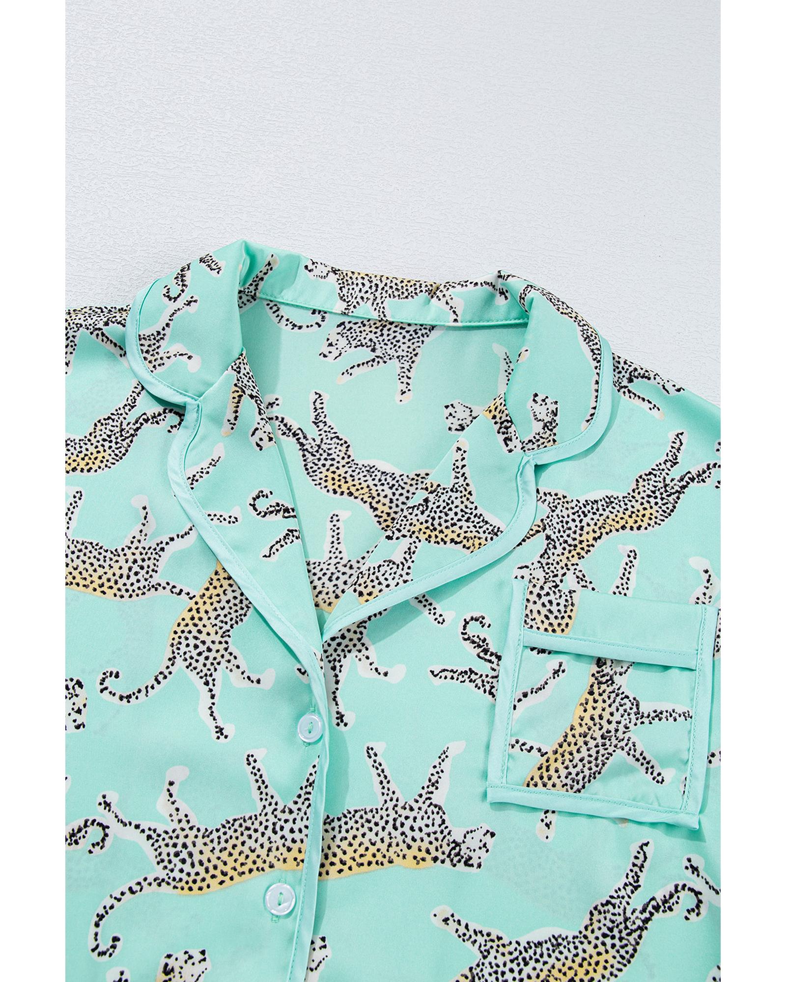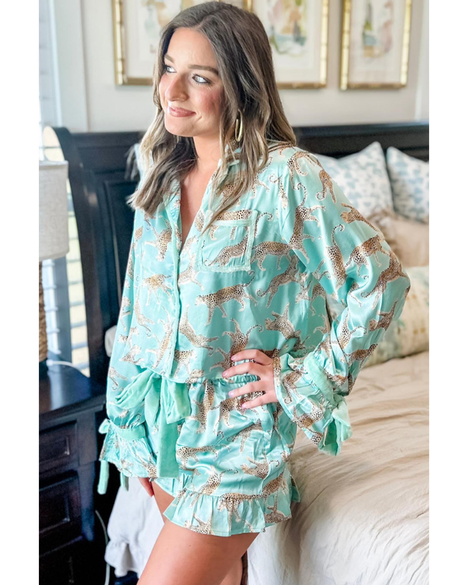 Green Leopard Satin Ruffle Pajama Short Set – L