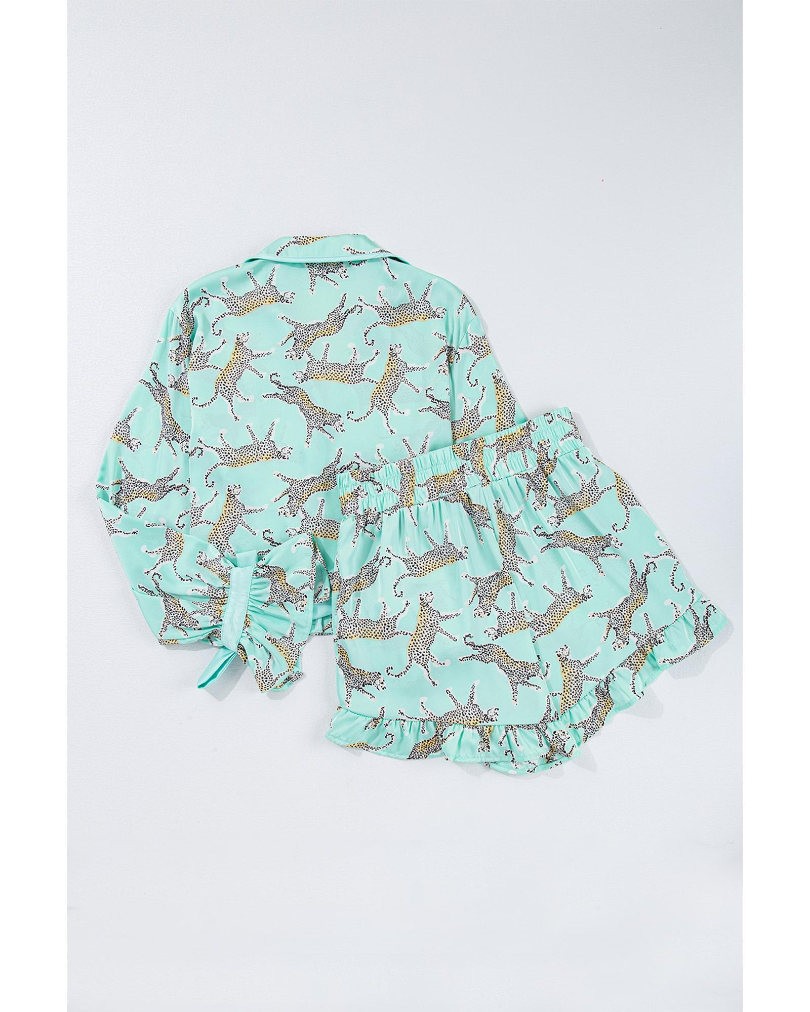 Green Leopard Satin Ruffle Pajama Short Set – M