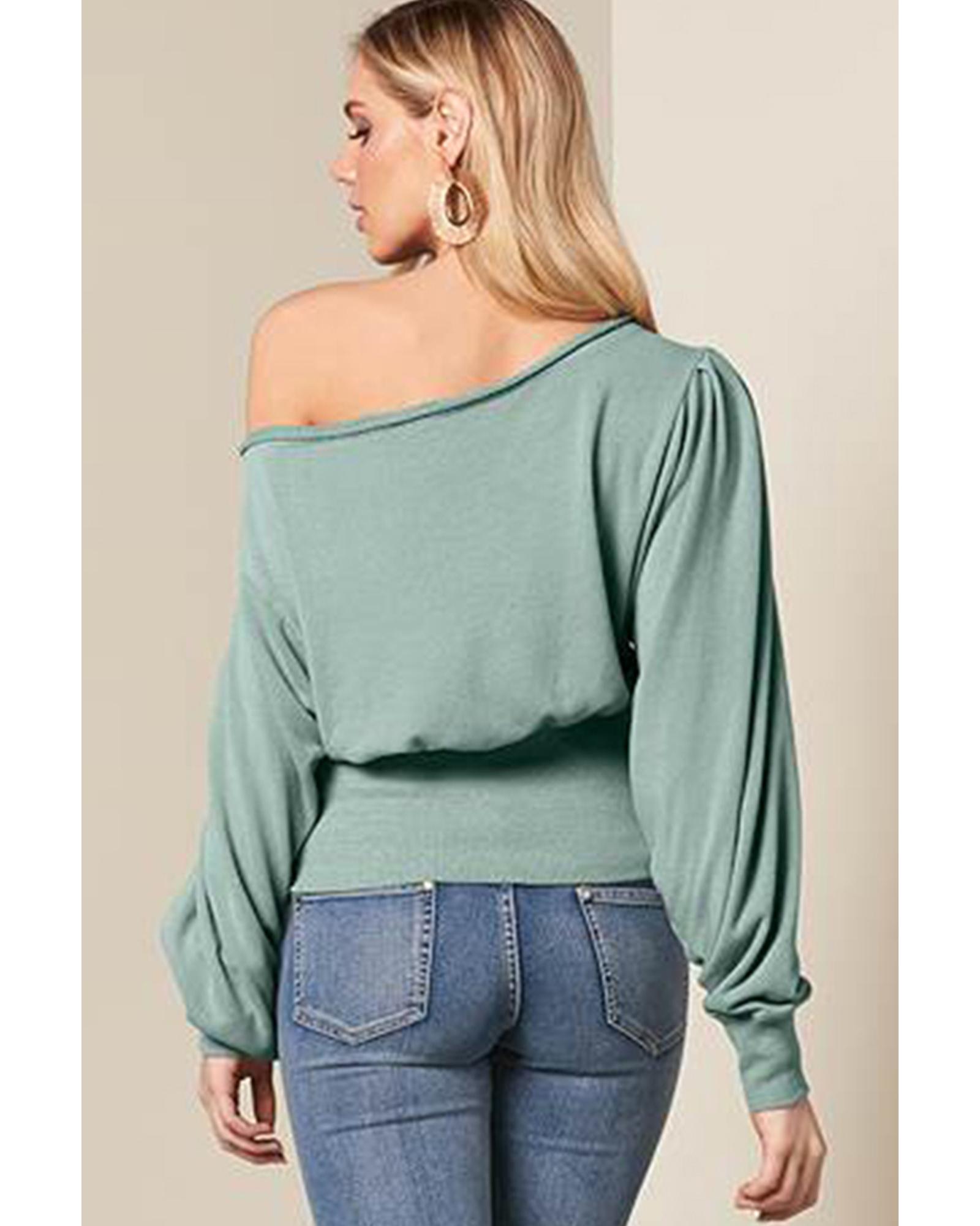 - Green Off Shoulder Bishop Sleeve Cinched Waist Blouse