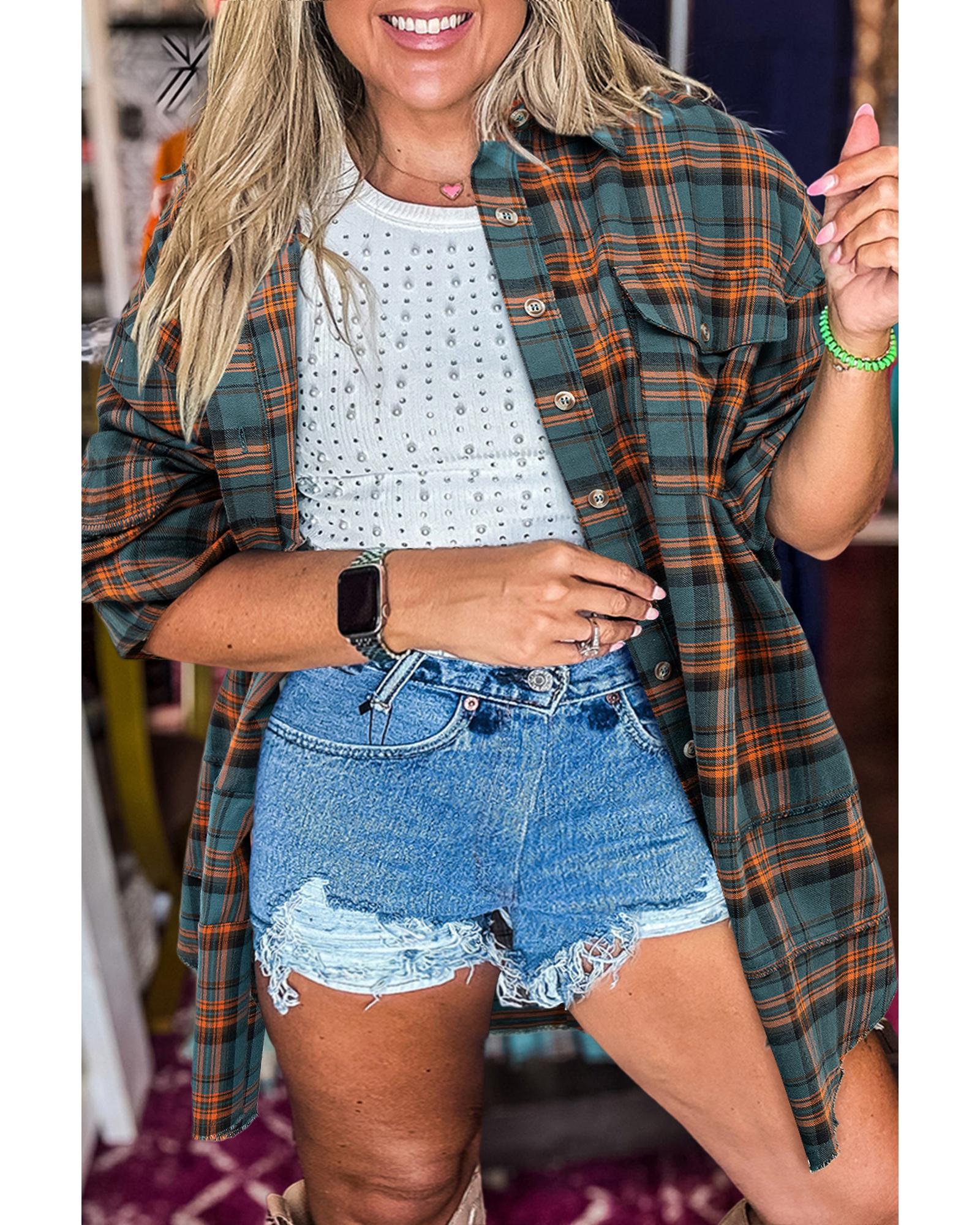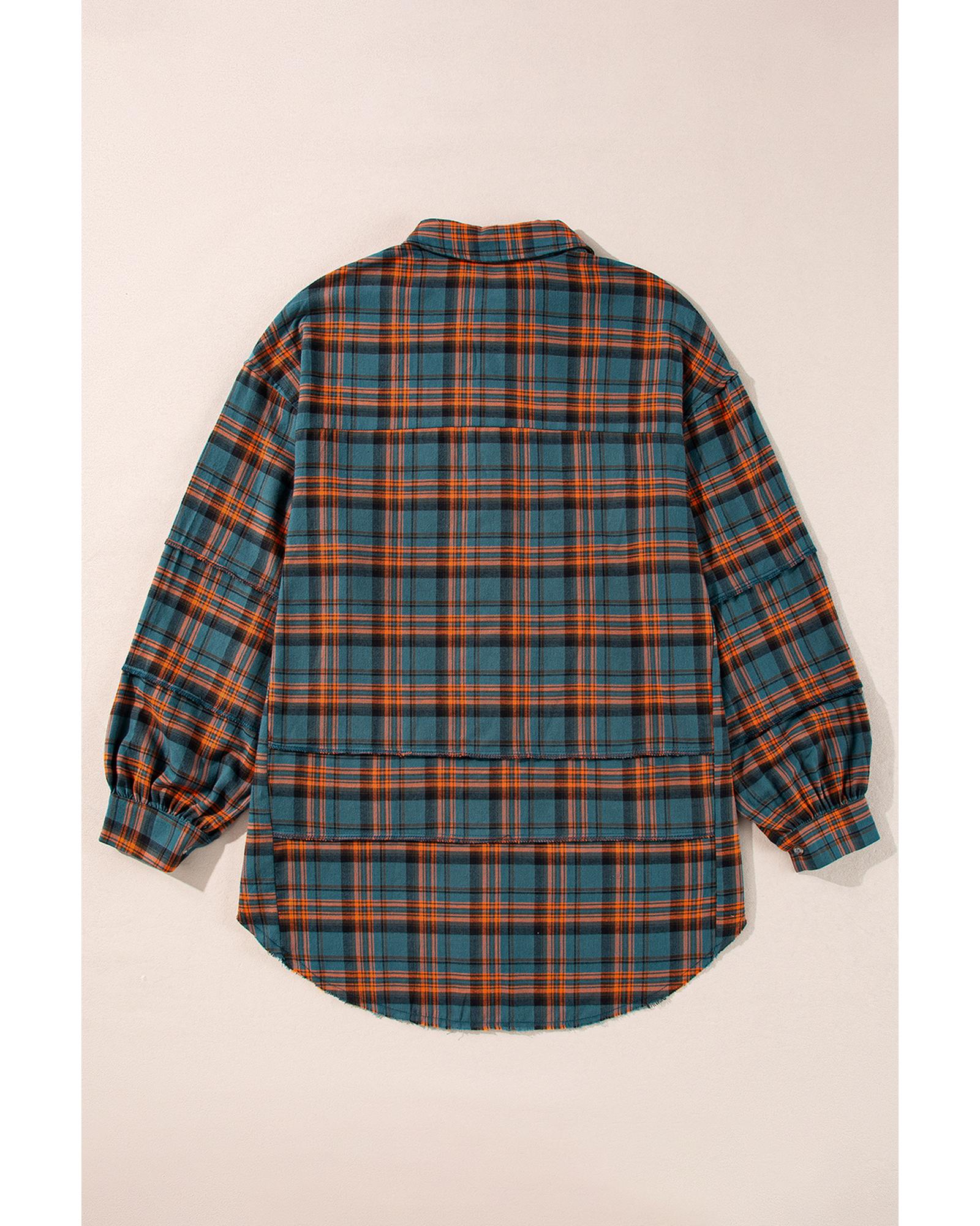 Green Plaid Long Sleeeve Side Split Distressed Hem Shirt – L