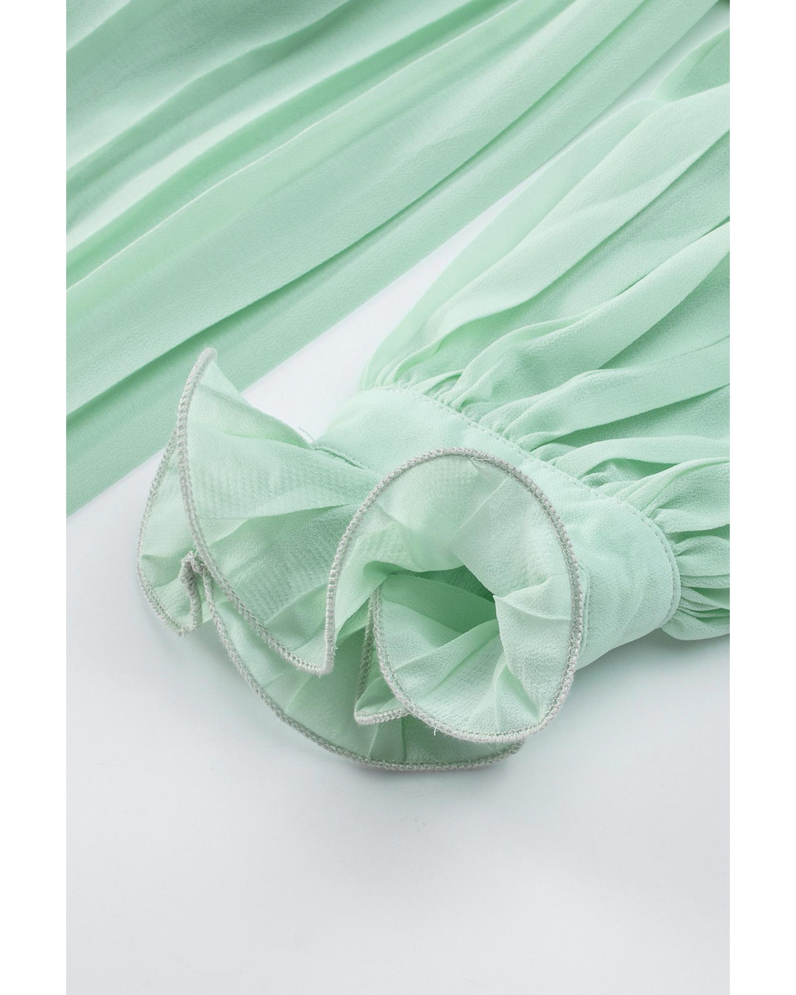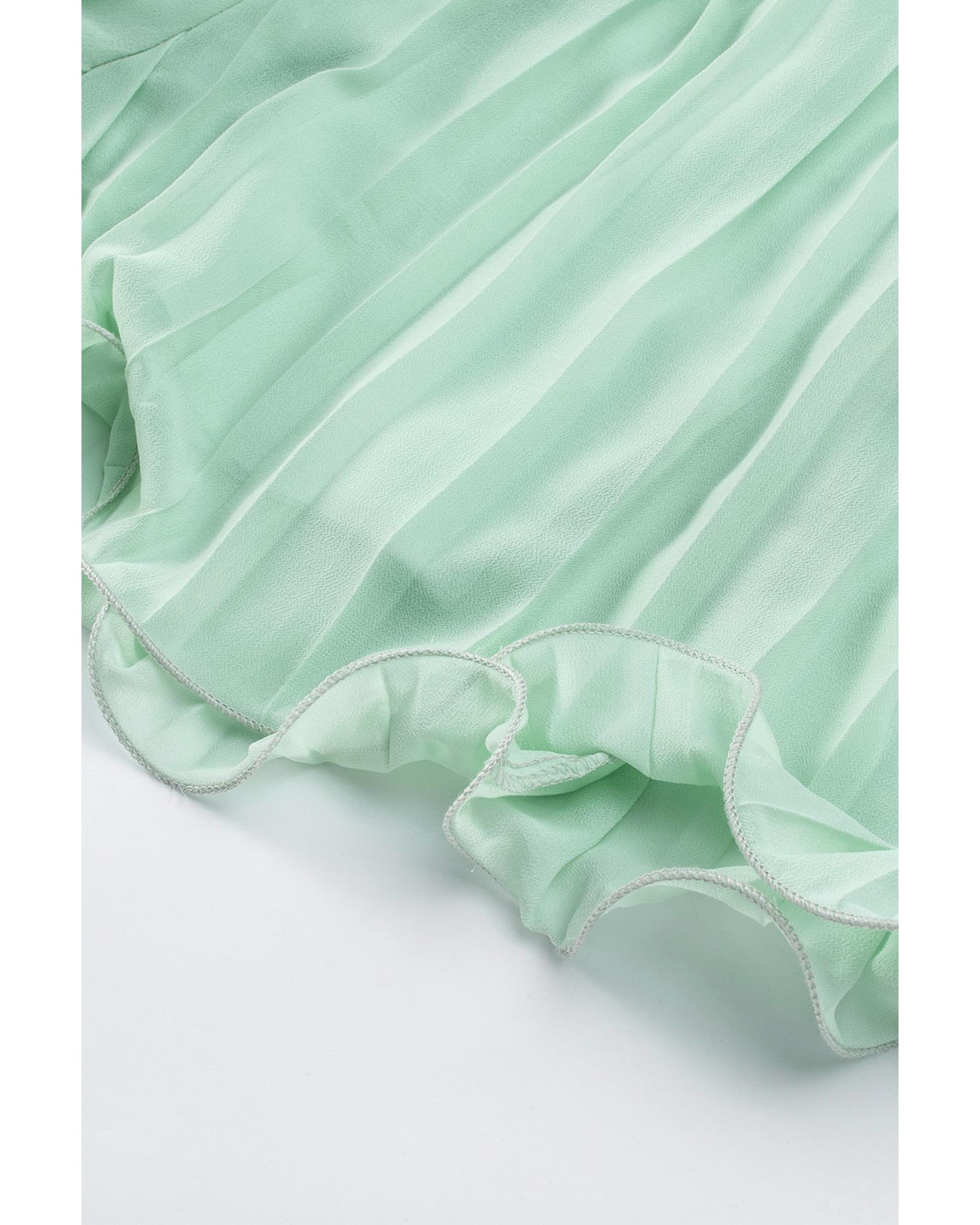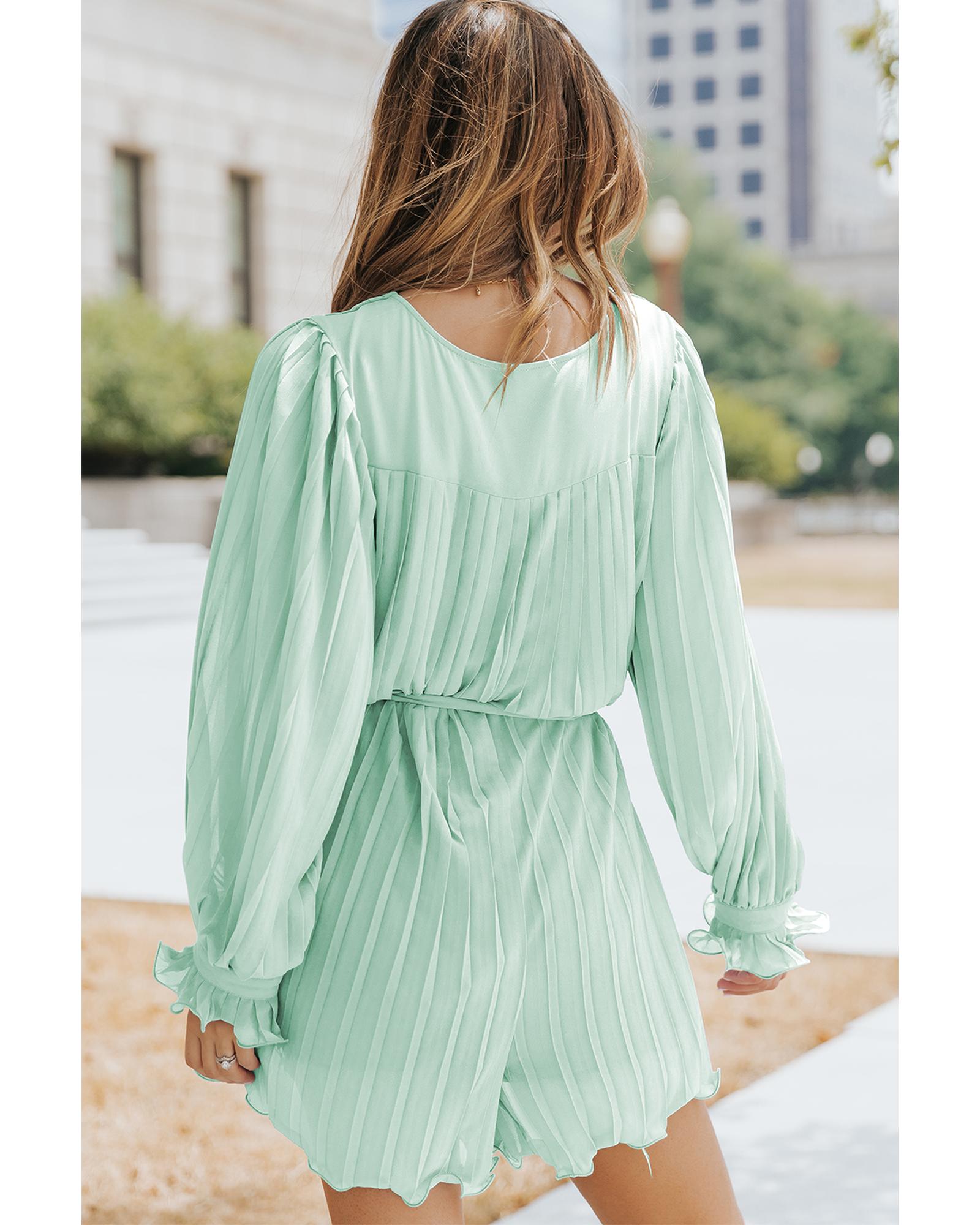 Green Pleated Ruffled Tie Waist Buttons V Neck Romper – M
