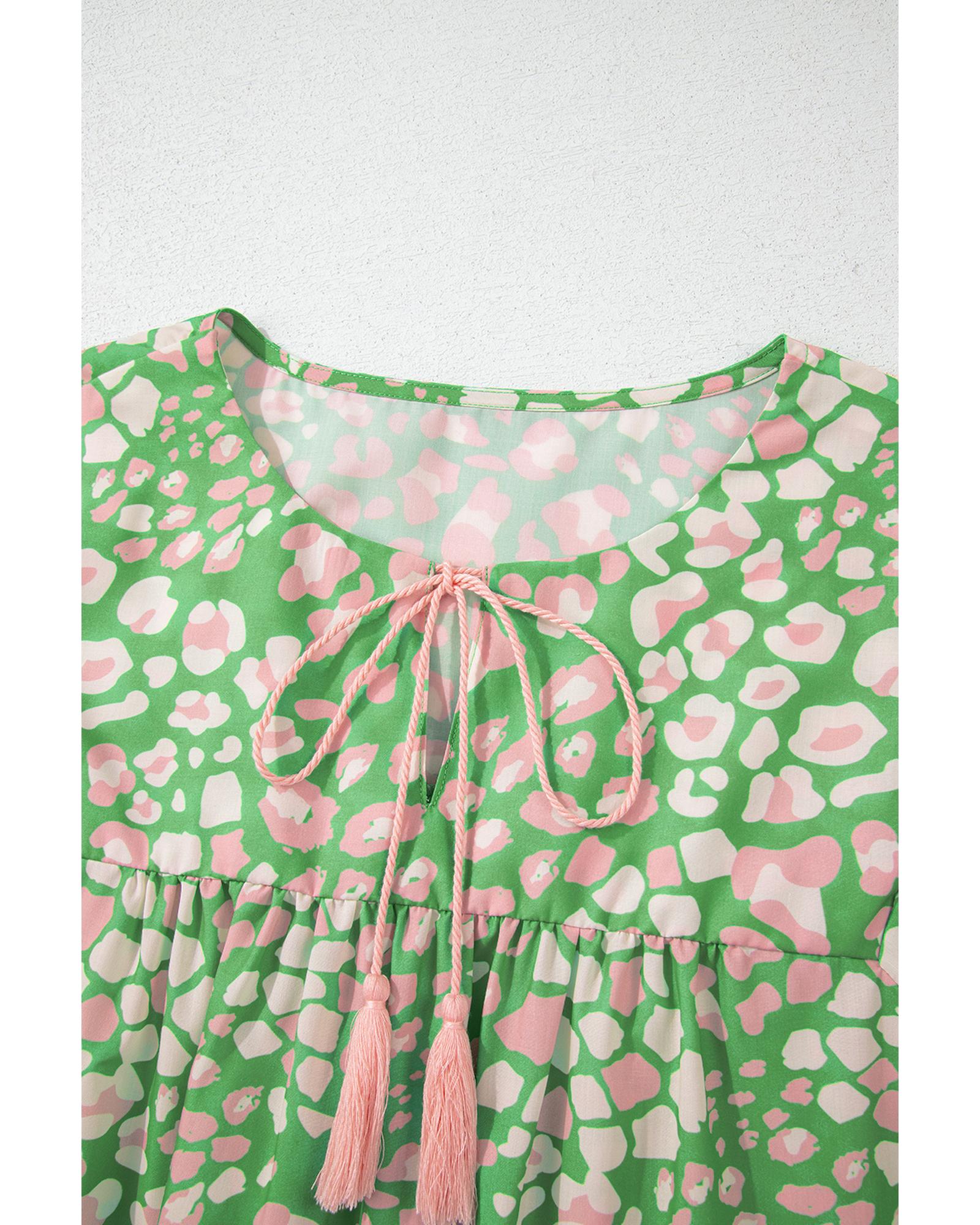 Green Plus Size Floral Tassel Tie Split Neck Puff Sleeve Blouse – 3X