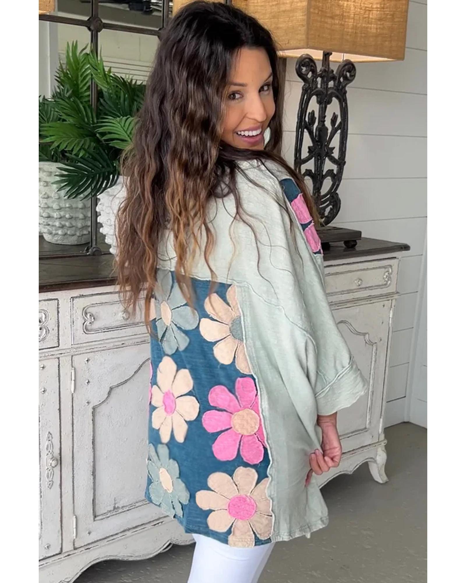 Green Plus Size Flower Patchwork Exposed Seam High Low Top - 2X