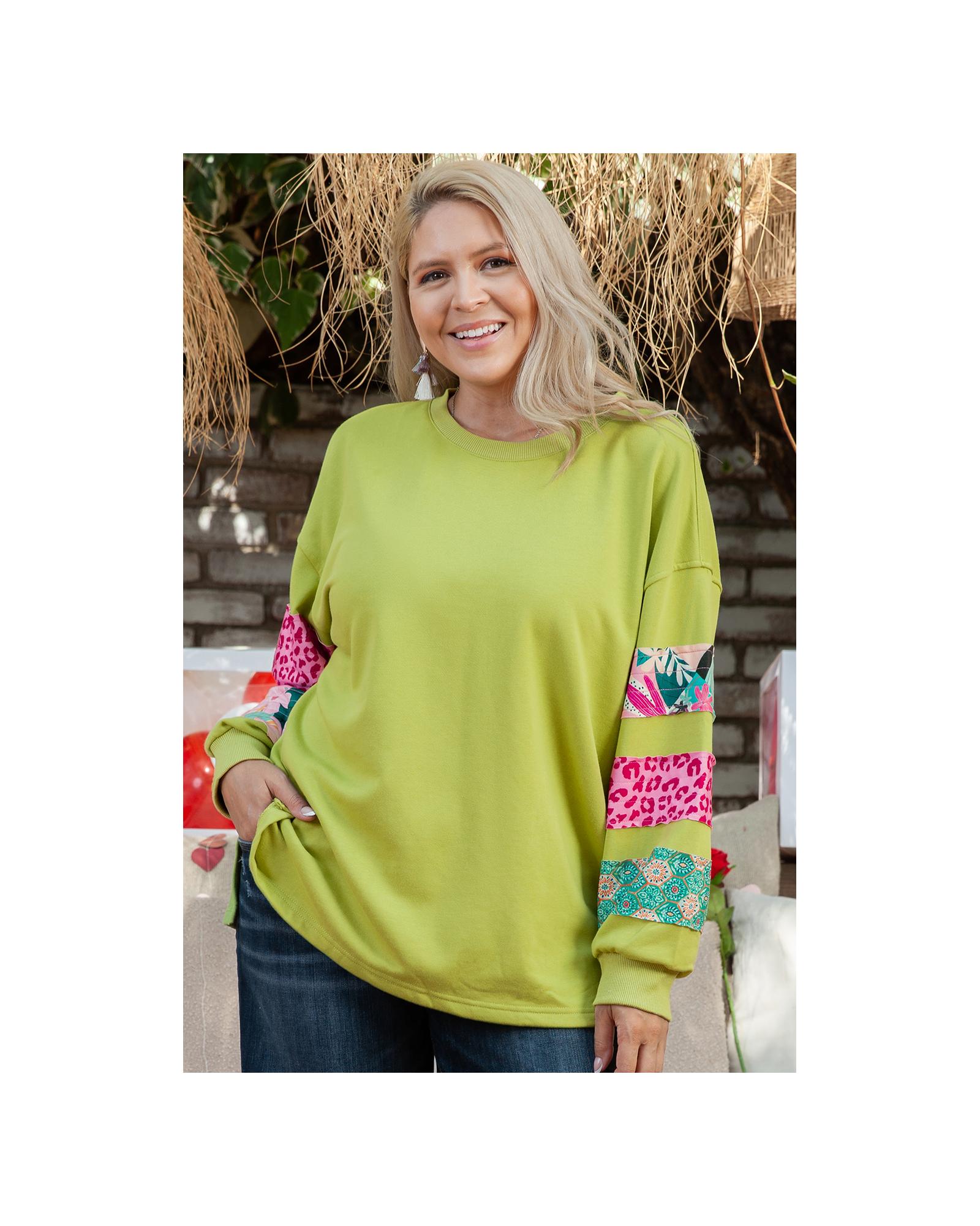 Green Plus Size Printed Patchwork Sleeve Split Sweatshirt – 3X