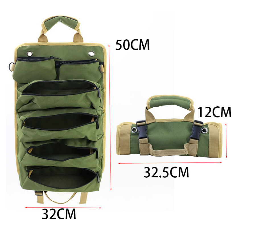 Green Portable Roll-Up Tool Organizer with Zippered Pockets