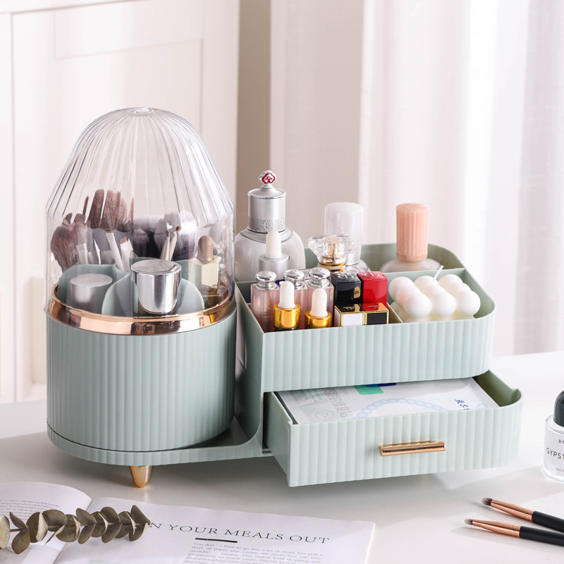Streamline your makeup and accessories storage with this stylish and functional rotating makeup organizer. Featuring multiple compartments and a dustproof dome cover, it ensures your cosmetics stay organized and clean while adding elegance to your vanity or bathroom counter.
