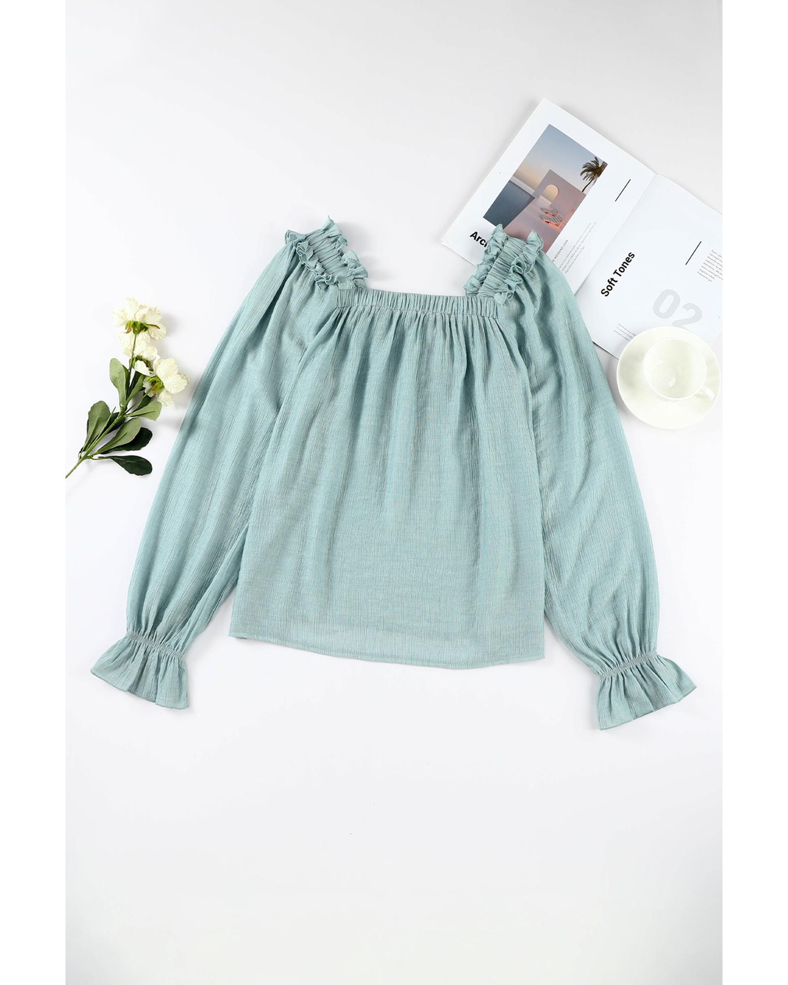 Green Ruffled Square Neck Cuffs Long Sleeve Blouse – M