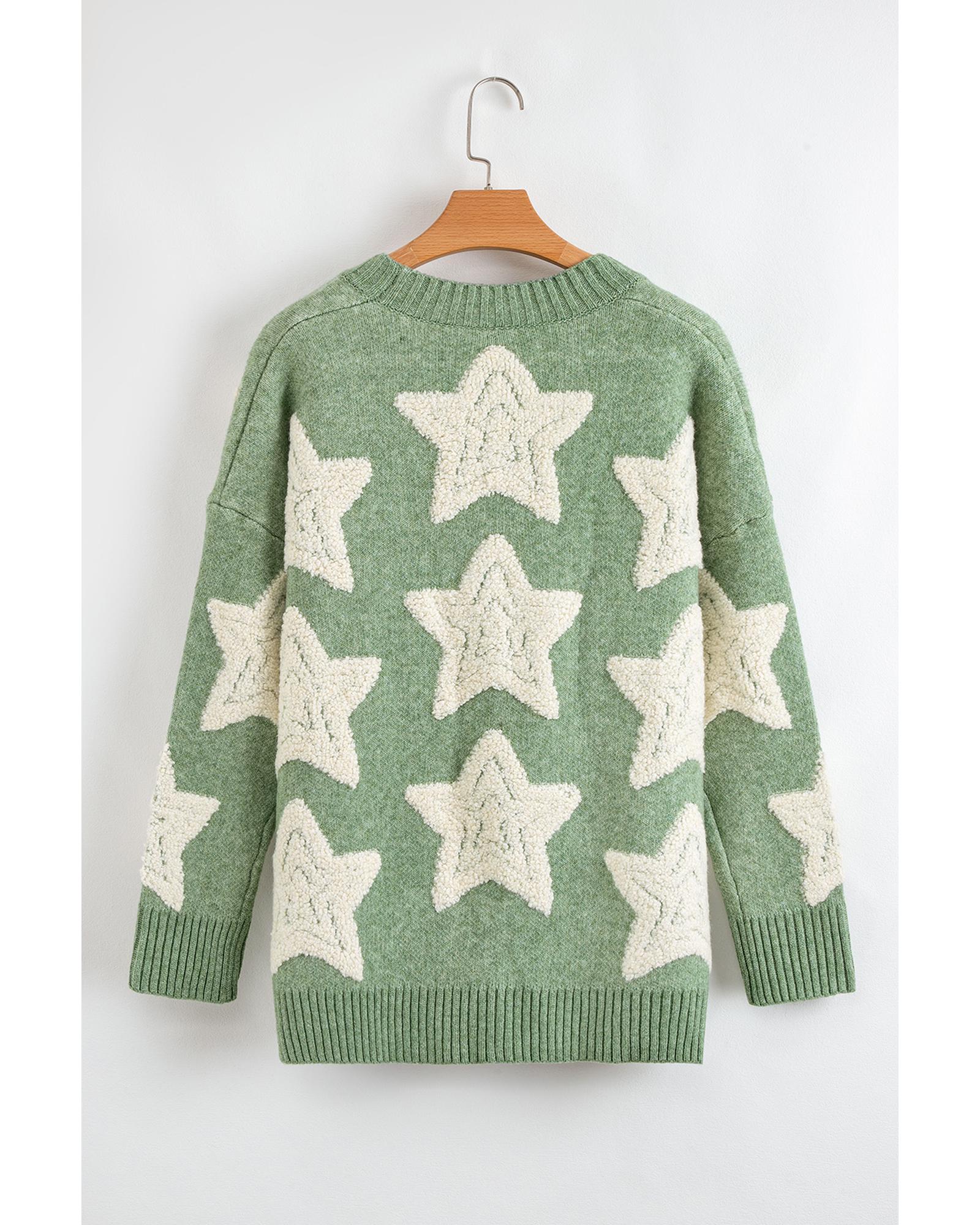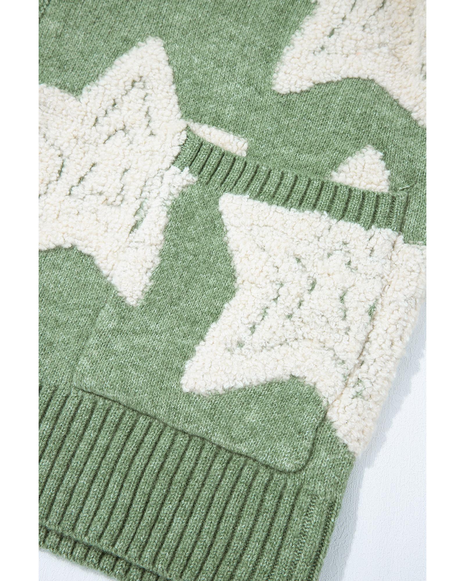 - Green Sherpa Star Pattern Textured Sweater Cardigan with Pockets
