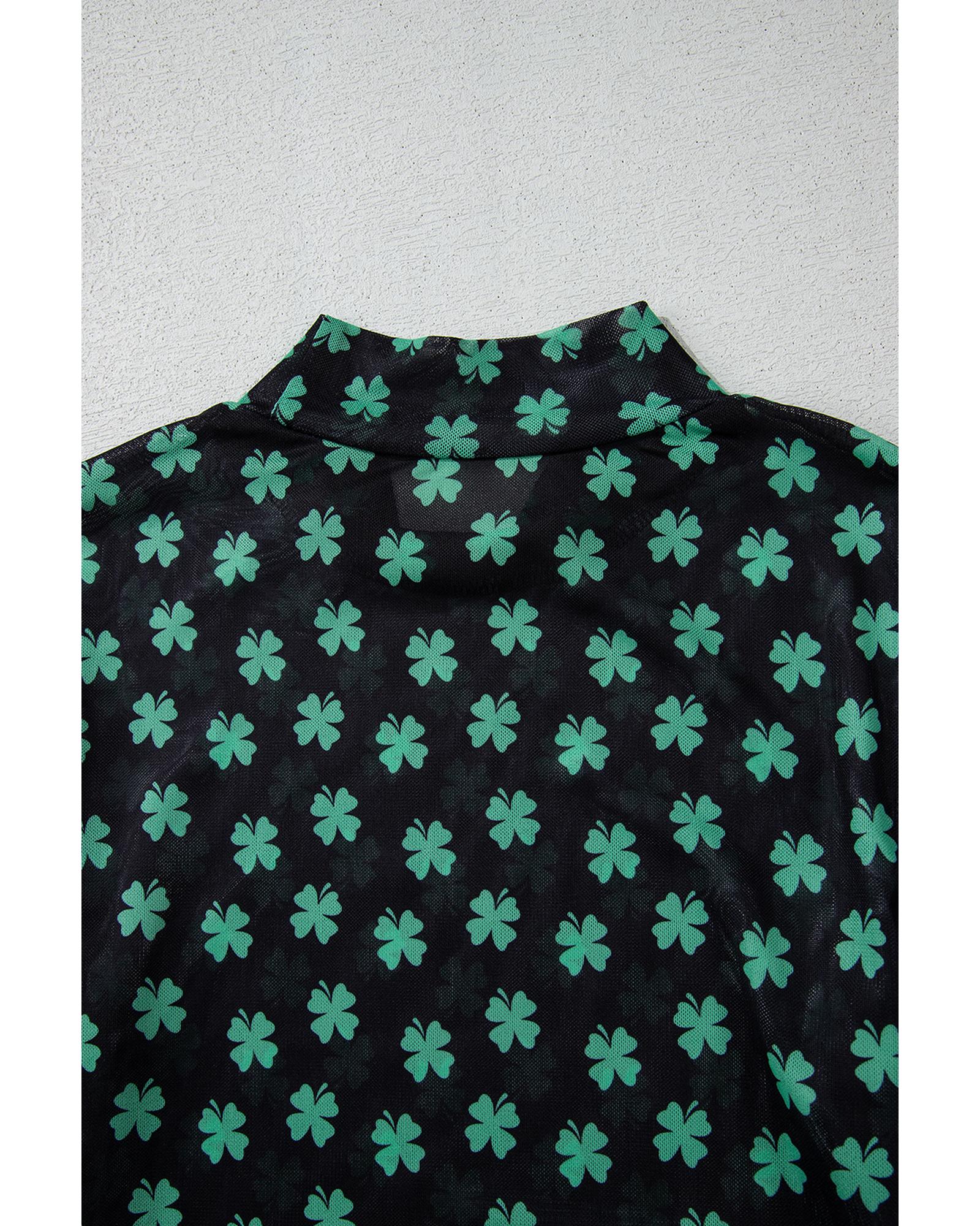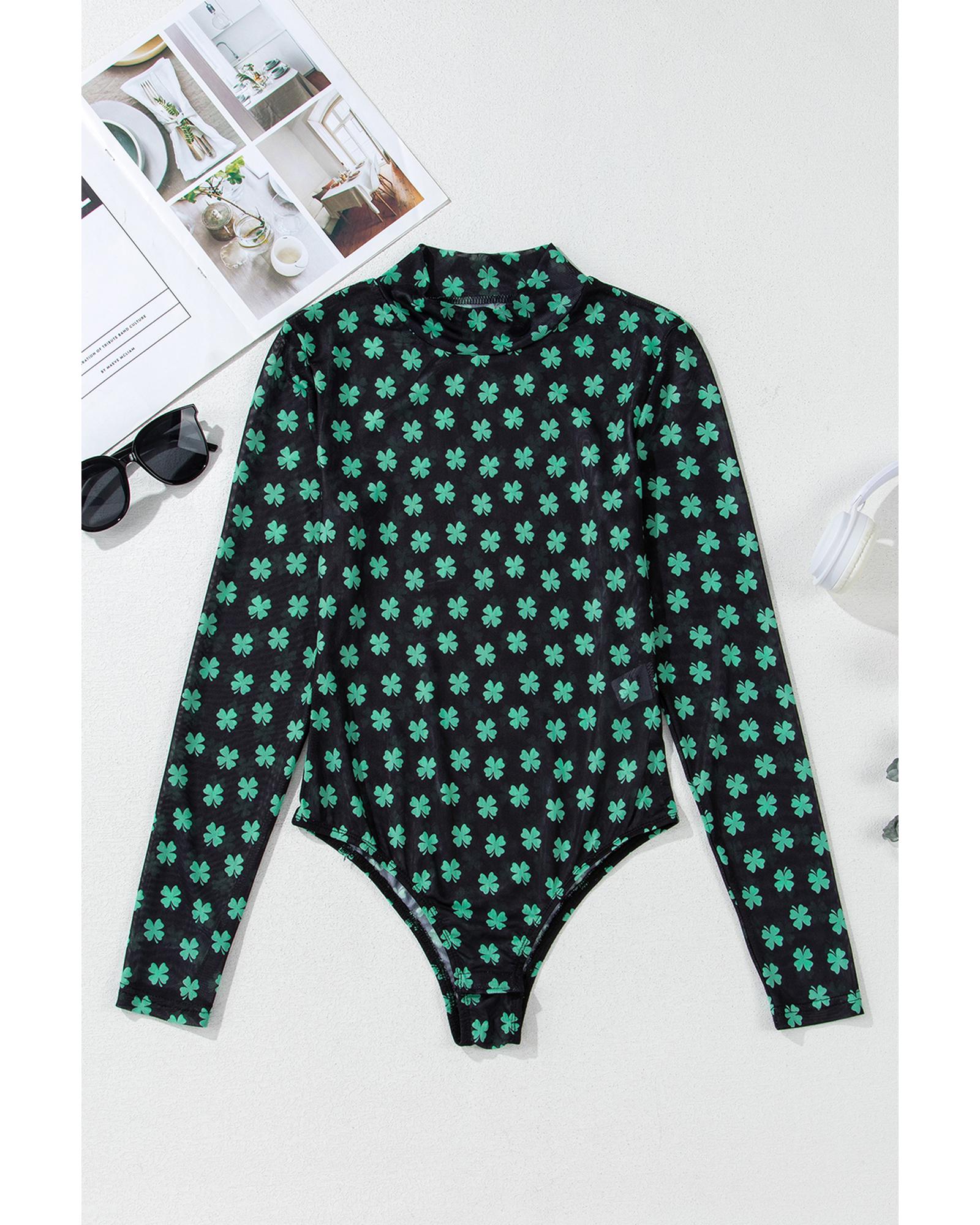 Green St Patrick Shamrock Printed Long Sleeve Mesh Bodysuit – M