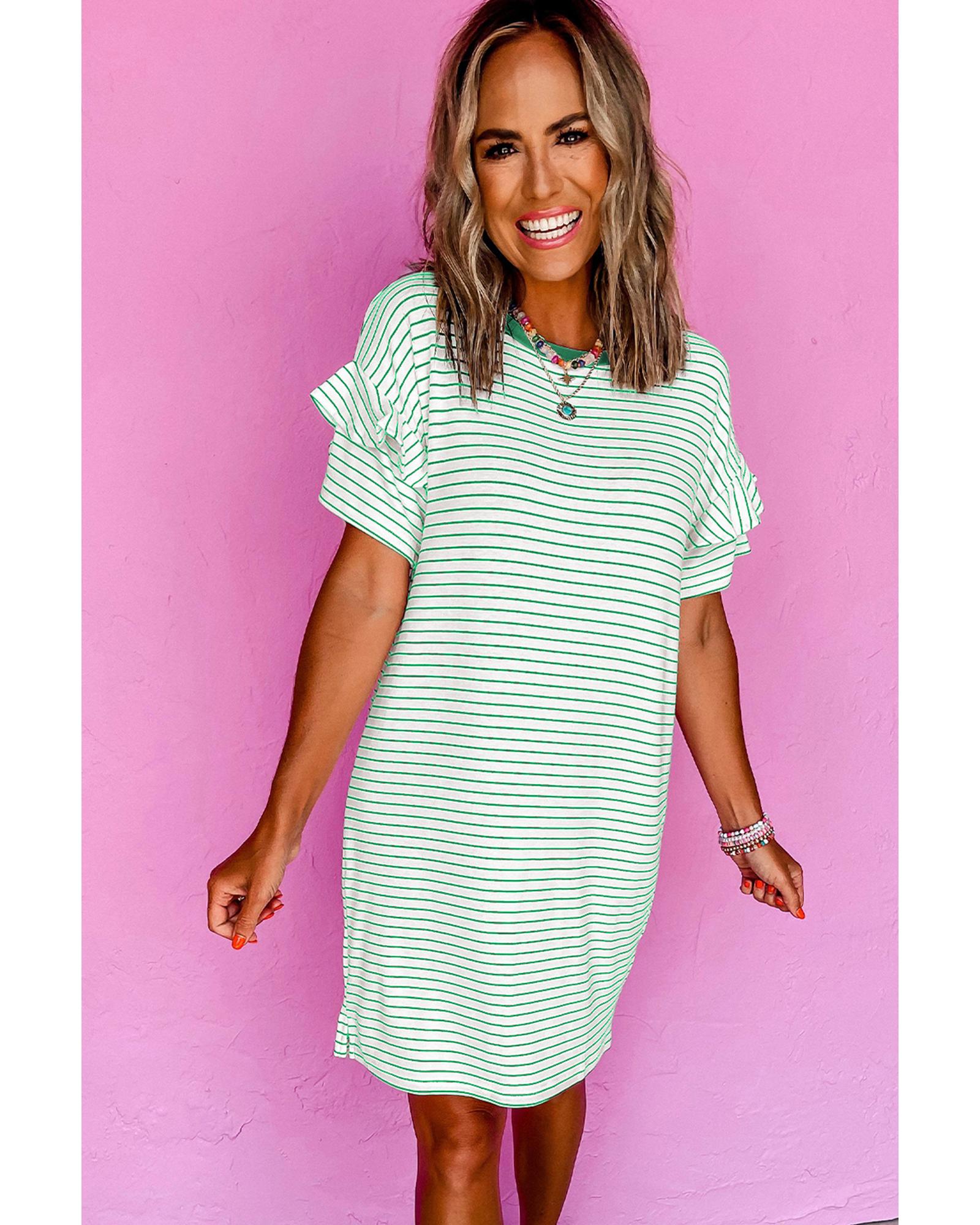Green Stripe Ruffled Short Sleeve Crew Neck T Shirt Shift Mini Dress – XL
