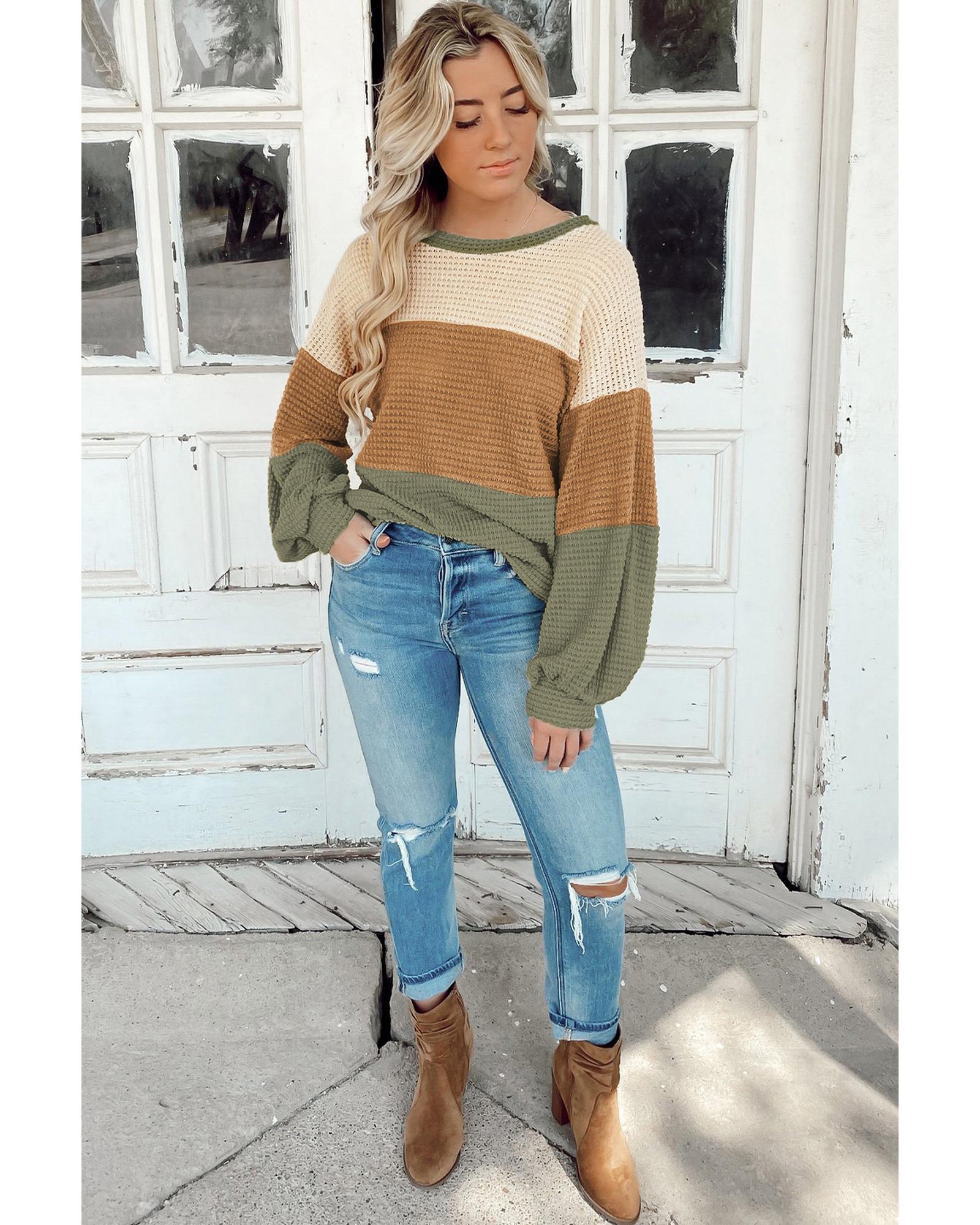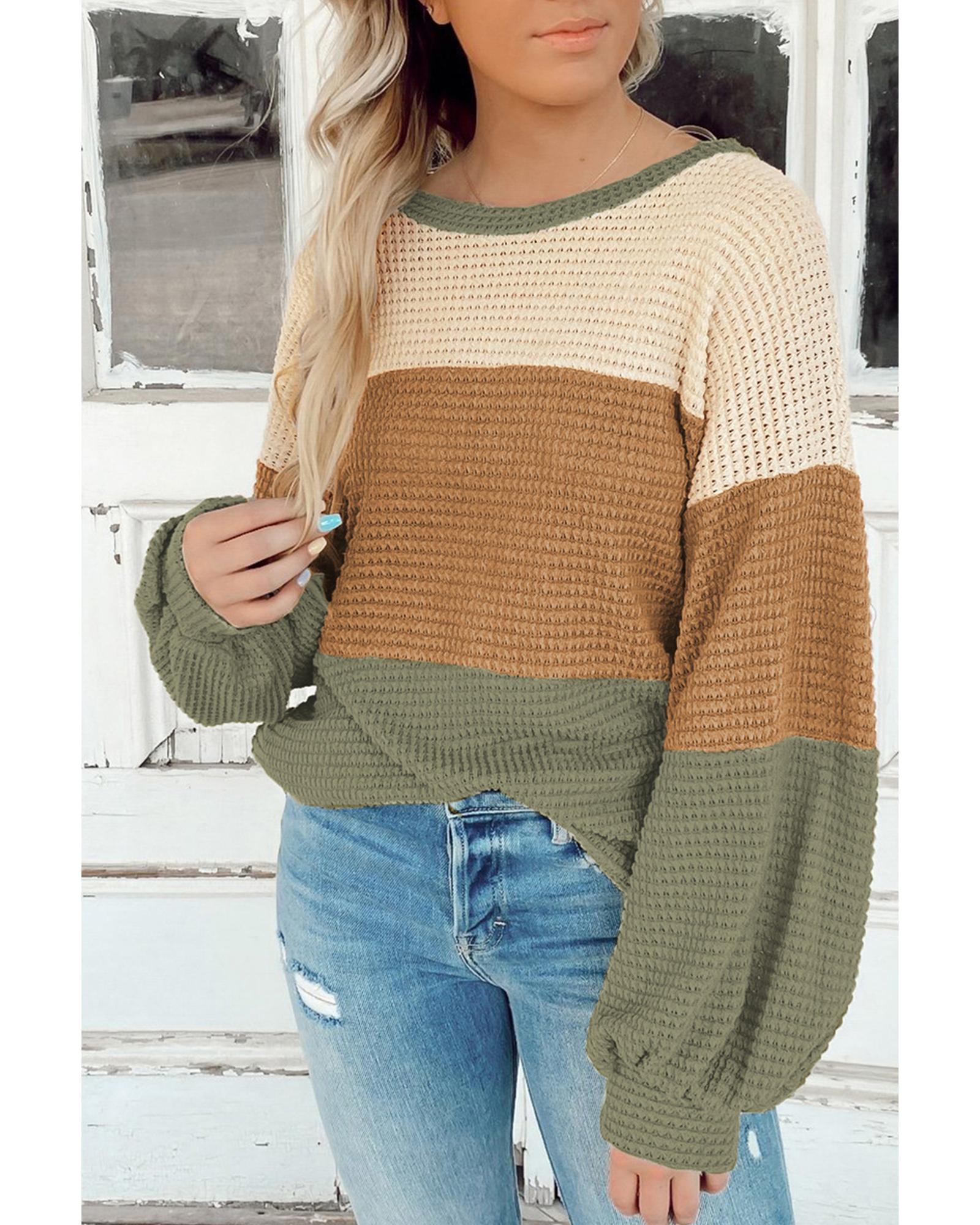 Green Stripe Textured Color Block Bubble Sleeve Baggy Top – S