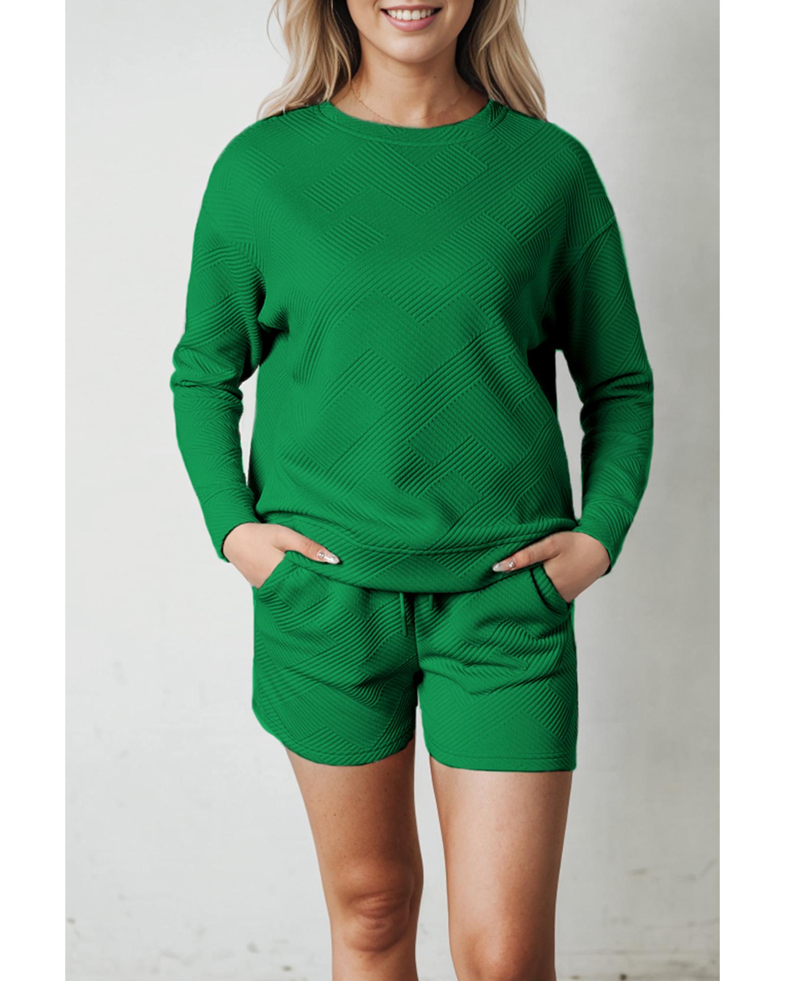 Green Textured Long Sleeve Top and Drawstring Shorts Set – S