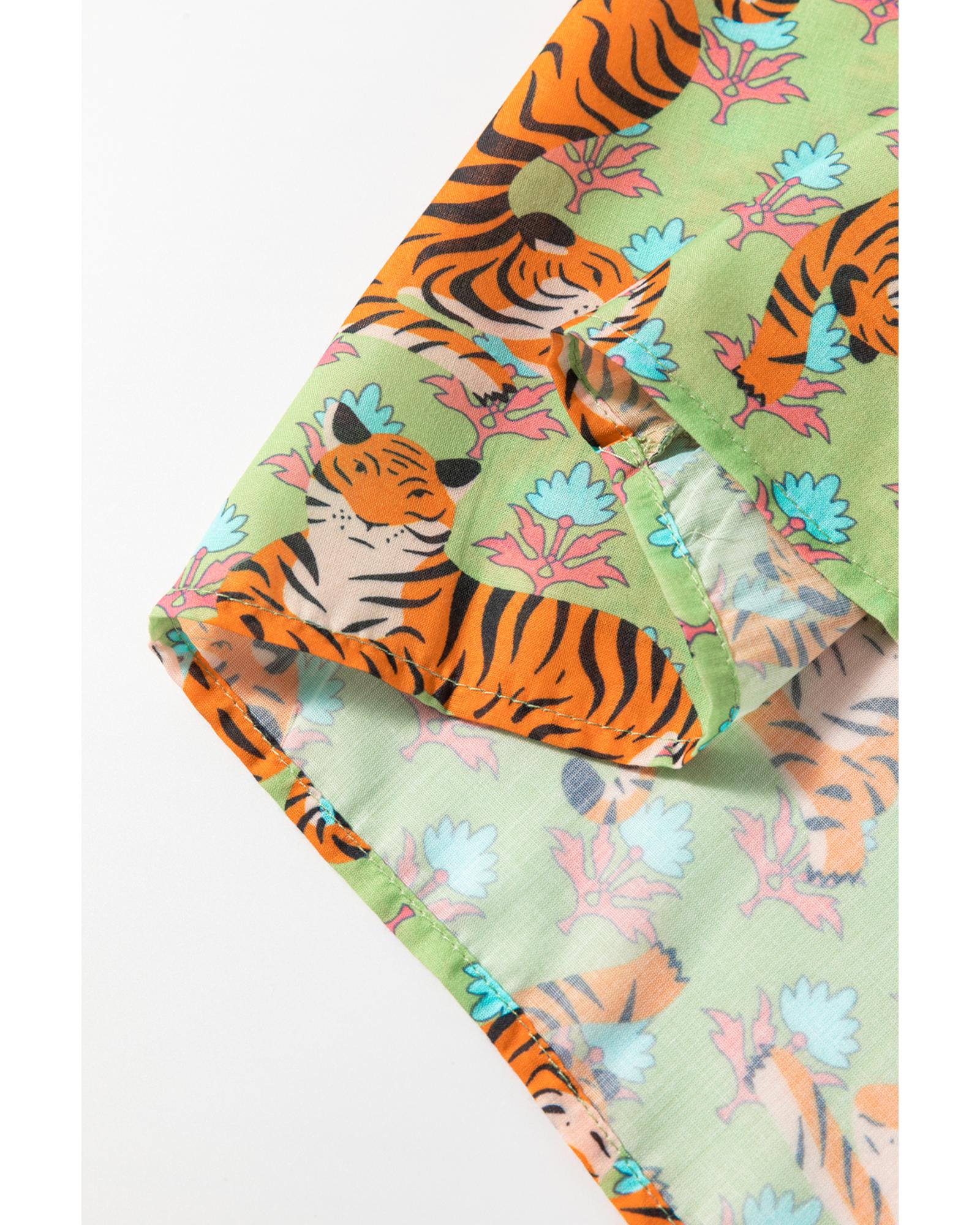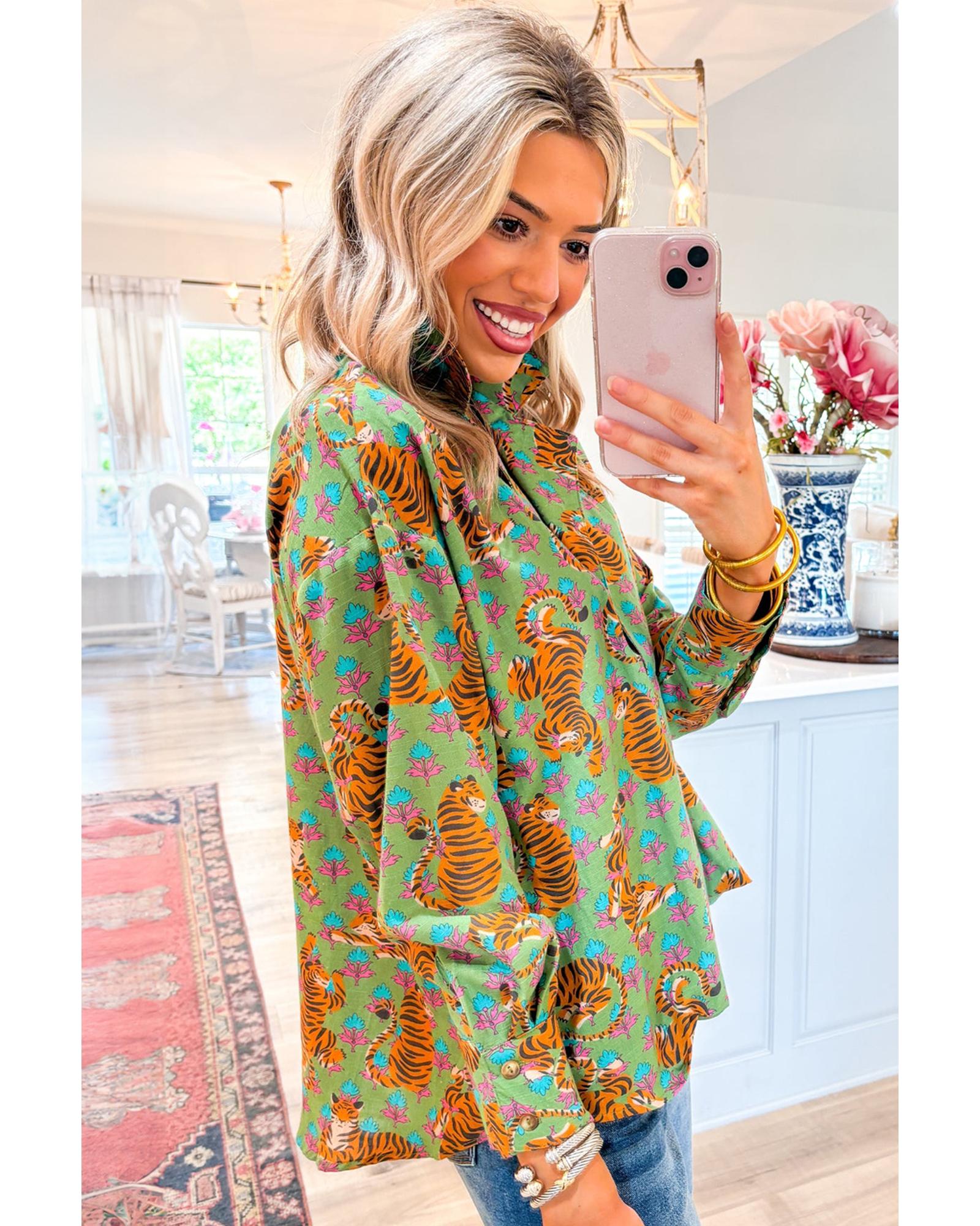 Green Tiger Floral Printed Collared V Neck Casual Shirt – L
