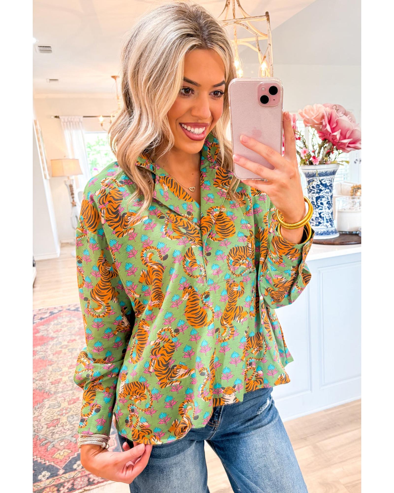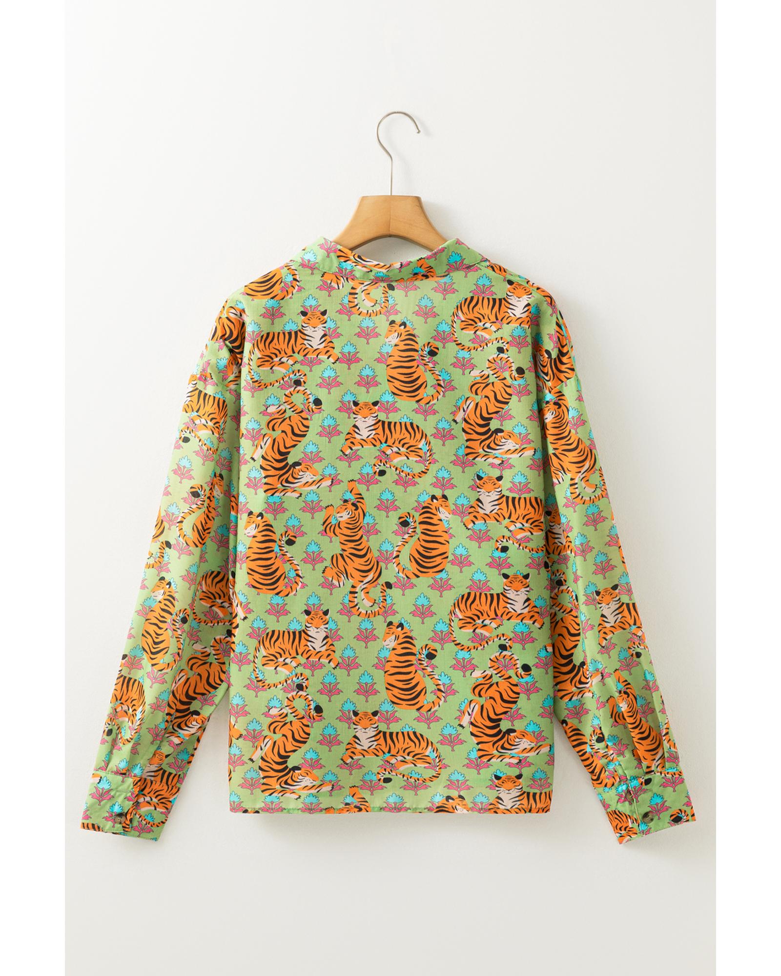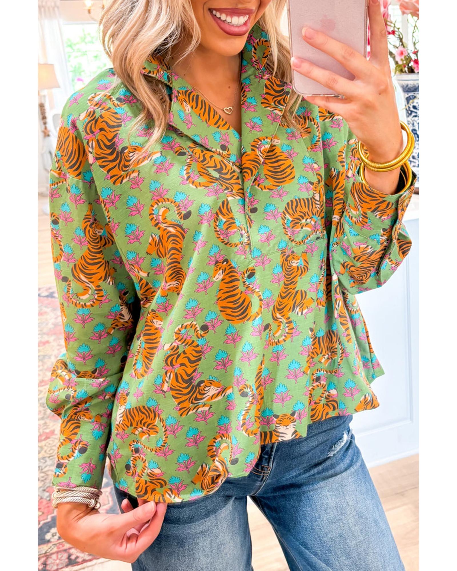 Green Tiger Floral Printed Collared V Neck Casual Shirt – S