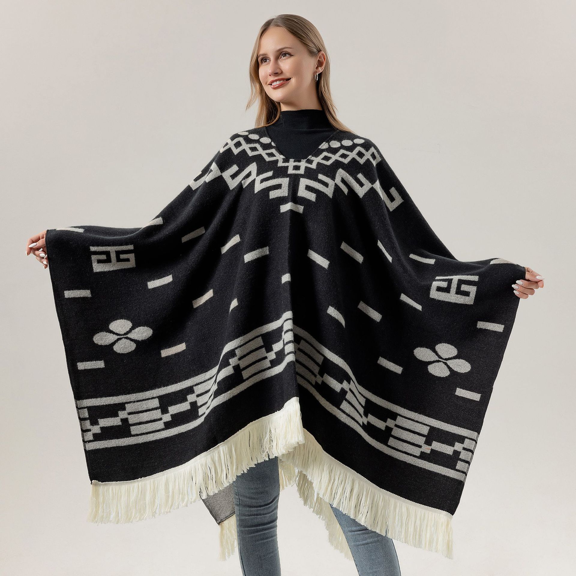 Women’s Versatile Faux Cashmere Poncho Cape Shawl with Geometric Pattern & Fringe Trim