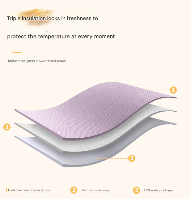 - Triple-Layer Insulation: Features a premium three-layer insulation system: a durable outer Oxford fabric, a thick pearl cotton insulation middle layer, and a food-grade PEVA waterproof inner lining. This construction effectively keeps food hot, cold, and fresh for hours.