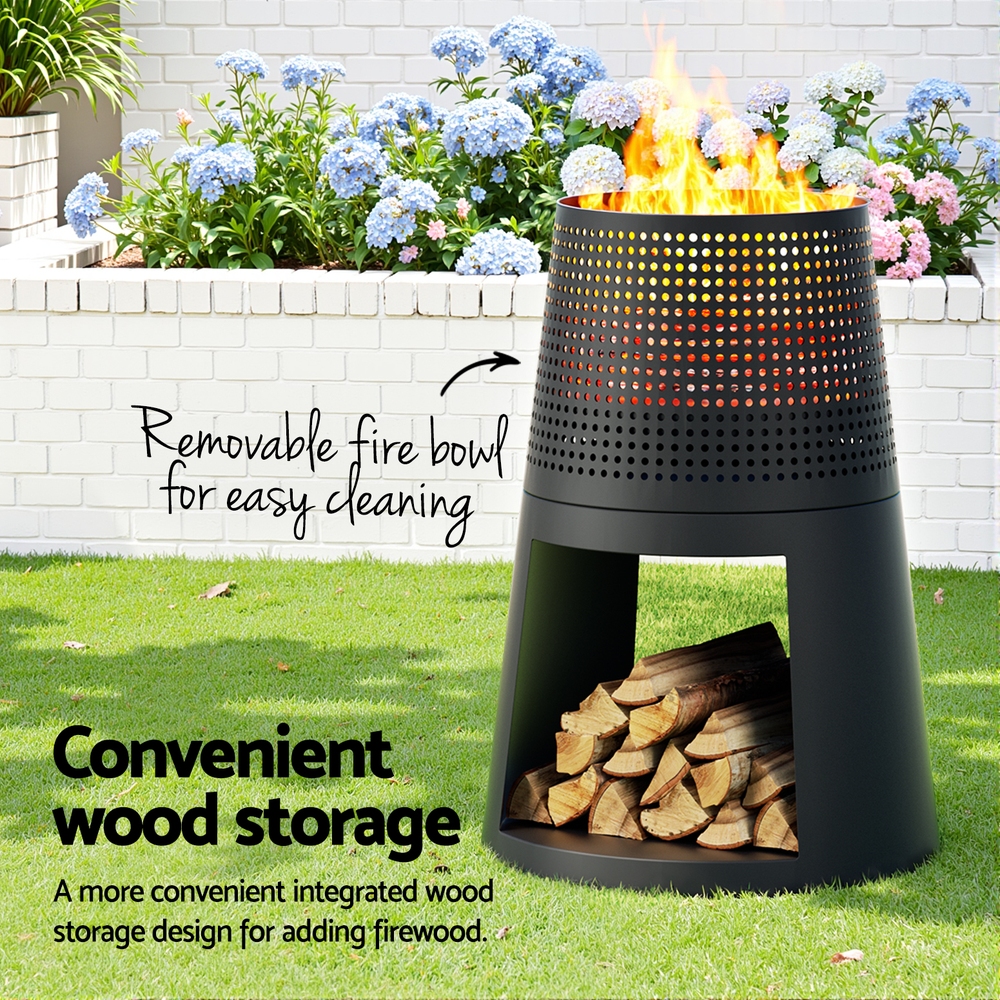 The Grillz fire pit’s deep bowl features thickened steel walls and a windproof mesh screen, containing sparks while maintaining airflow�ideal for backyard parties or camping. Its 36cm-wide burning area holds large wood/charcoal stacks.Built-in log storage keeps fuel dry and accessible. The removable fire bowl simplifies ash cleanup, and tool-free assembly allows quick setup. The forged-metal frame adds rustic charm, delivering warmth, safety, and ambiance in a durable design.