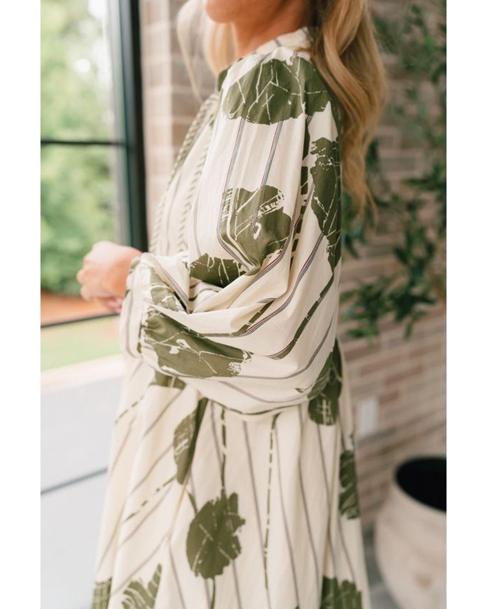 Guacamole Green Floral Striped Print Contrast Piping Puff Sleeve Dress – L