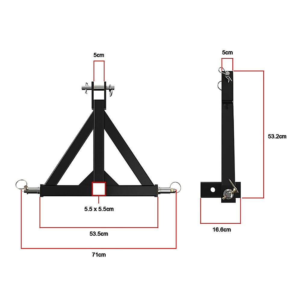 It's simple to install just tighten the attachment at the tractor lever's proper position. Its three-point suspension towbar allows you to manoeuvre easily when hauling trailers and other heavy machinery, while its three-point quick hitch works with all of the Category 1 tractors on the market. It's ready to go right out of the box it even comes with both the top and bottom pins for easy installation from the day you take delivery. Get a hitch that works as hard as you do. Order one of these tough three-point hitches today.