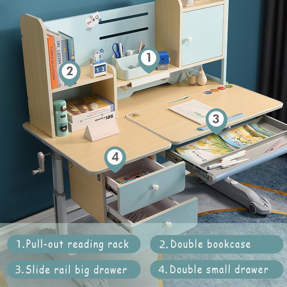 This Ergonomic Multi-Function kid’s desk can be your child’s ideal learning partner! This Kids writing table is made of solid rubber wood, with wood grain surface, height is adjustable from 55-75 cm for the desktop with locking rotary knobs to grow with your child. And the desktop can be tilted from 0-65angle to protect their eyesight and being Drafting Table. Kids can store their various stationery on the extra bookshelf or in the embedded pull-out drawer. The rotatable rack offers a proper distance and angle for reading books.