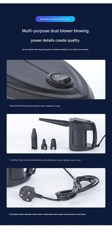 Unleash powerful cleaning performance with our High-Power Electric Air Duster. This versatile corded blower is designed to deliver a strong, continuous blast of air, making it an ideal solution for cleaning dust and debris from hard-to-reach areas. With a high-speed motor reaching up to 35,000 RPM and a wind speed of 35m/s, it’s perfect for cleaning computer cases, keyboards, motherboards, car interiors, and other sensitive electronics. The unit comes with four detachable nozzle attachments to suit various cleaning tasks. Its comfortable, handheld design and long 3-meter power cord provide excellent reach and ease of use for any cleaning job.