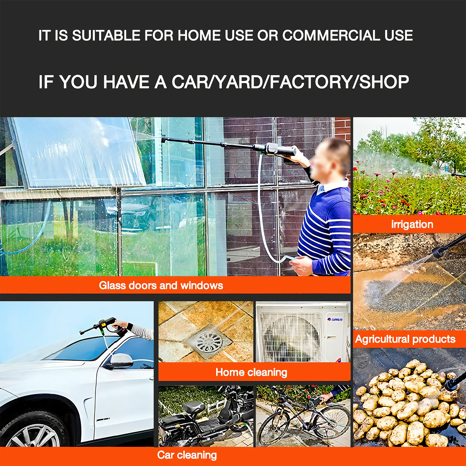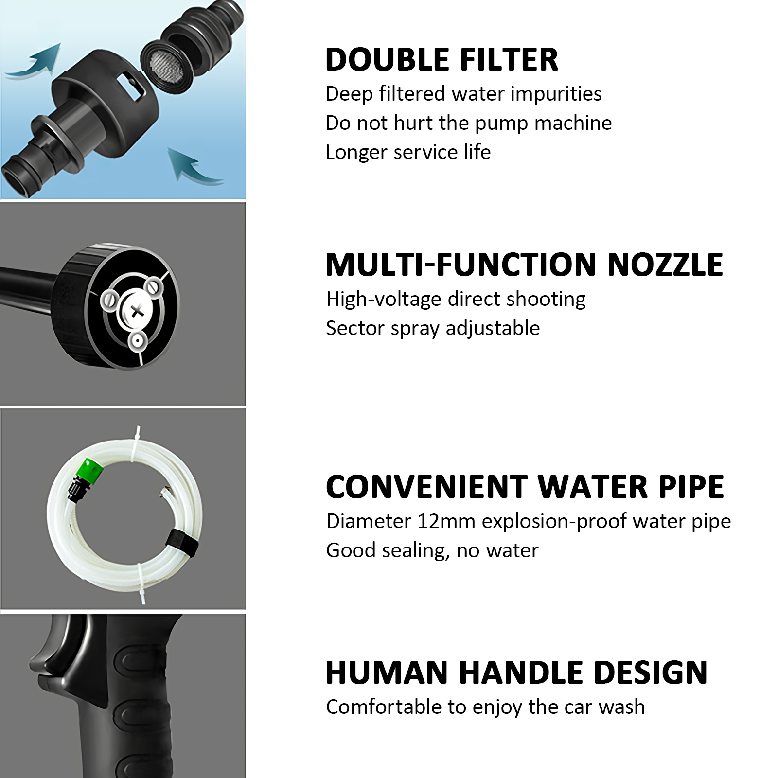 2. The 20 ft hose with filter basket can effectively and deeply filter impurities, particles, waste leaves, sludge, etc., better protect our pressure machine. Compared with traditional washing machines, our cordless power washer is lighter and more portable. It is the best choice for outdoor camping and long trips.