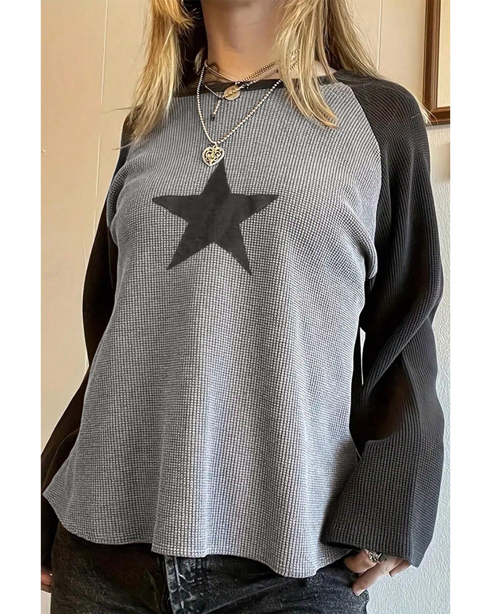 - High Waffle Knit Colorblock Star Patch Graphic Raglan Top